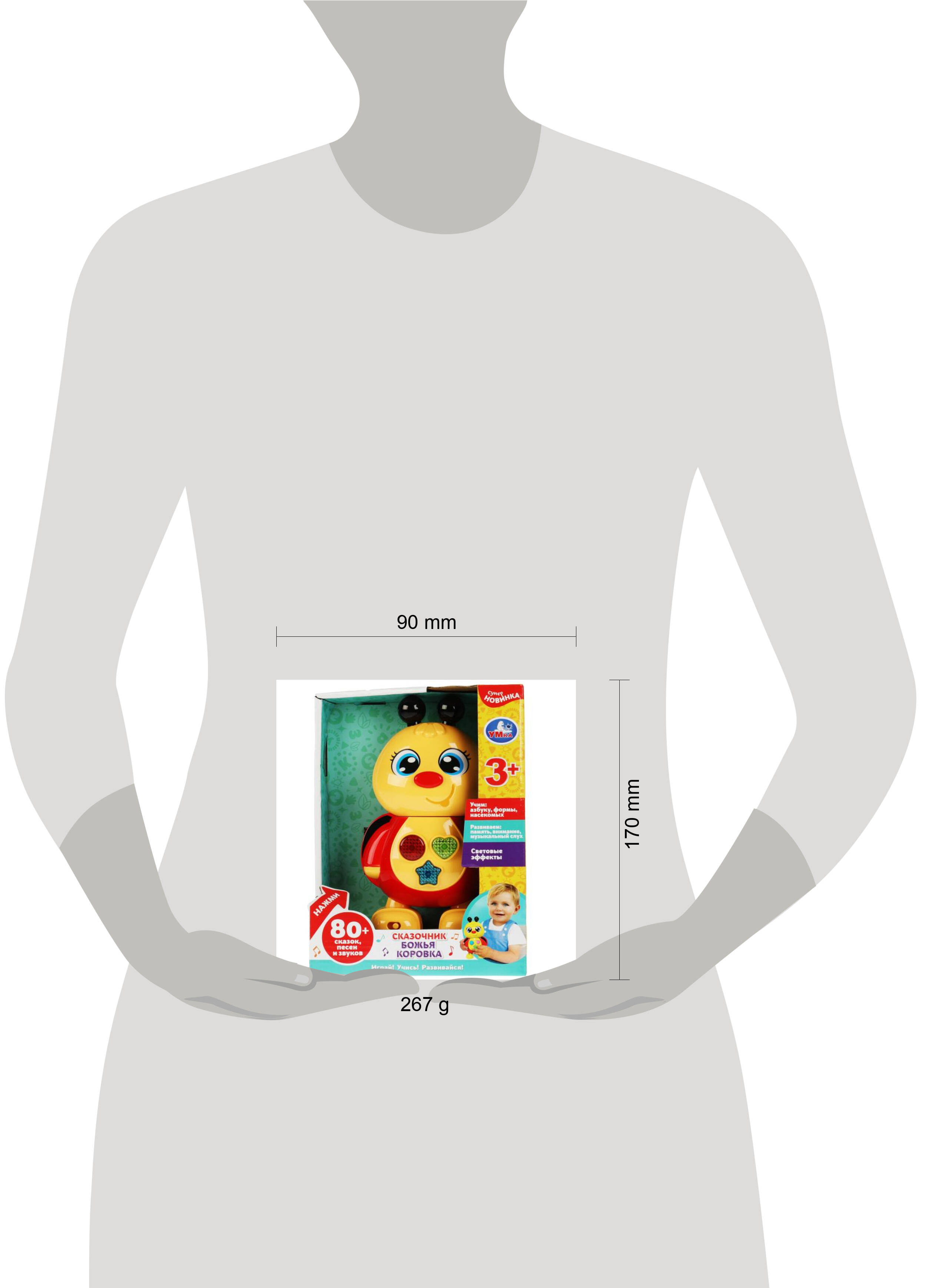 Развивающая игрушка "Божья коровка-сказочник" ТМ "УМка" станет прекрасным подарком для ребёнка: - 80 + сказок, песен и звуков - учим азбуку, формы и насекомых - световые эффекты Вашего малыша приведёт в восторг эта игрушка в виде забавной божьей коровки с тремя крупными кнопками разной формы. Он с удовольствием будет нажимать на эти кнопки и слушать увлекательные сказки, весёлые песенки и забавные звуки. Музыкальная игрушка ТМ "УМка" способствует развитию: - слухового восприятия и музыкального слуха - тактильных навыков - визуального восприятия - логического мышления - мелкой моторики Размер: 13 х 19 х 8 см. Материалы: пластмасса. Работает от 3-х батареек типа ААА (в комплекте). Рекомендовано детям от 1 года.