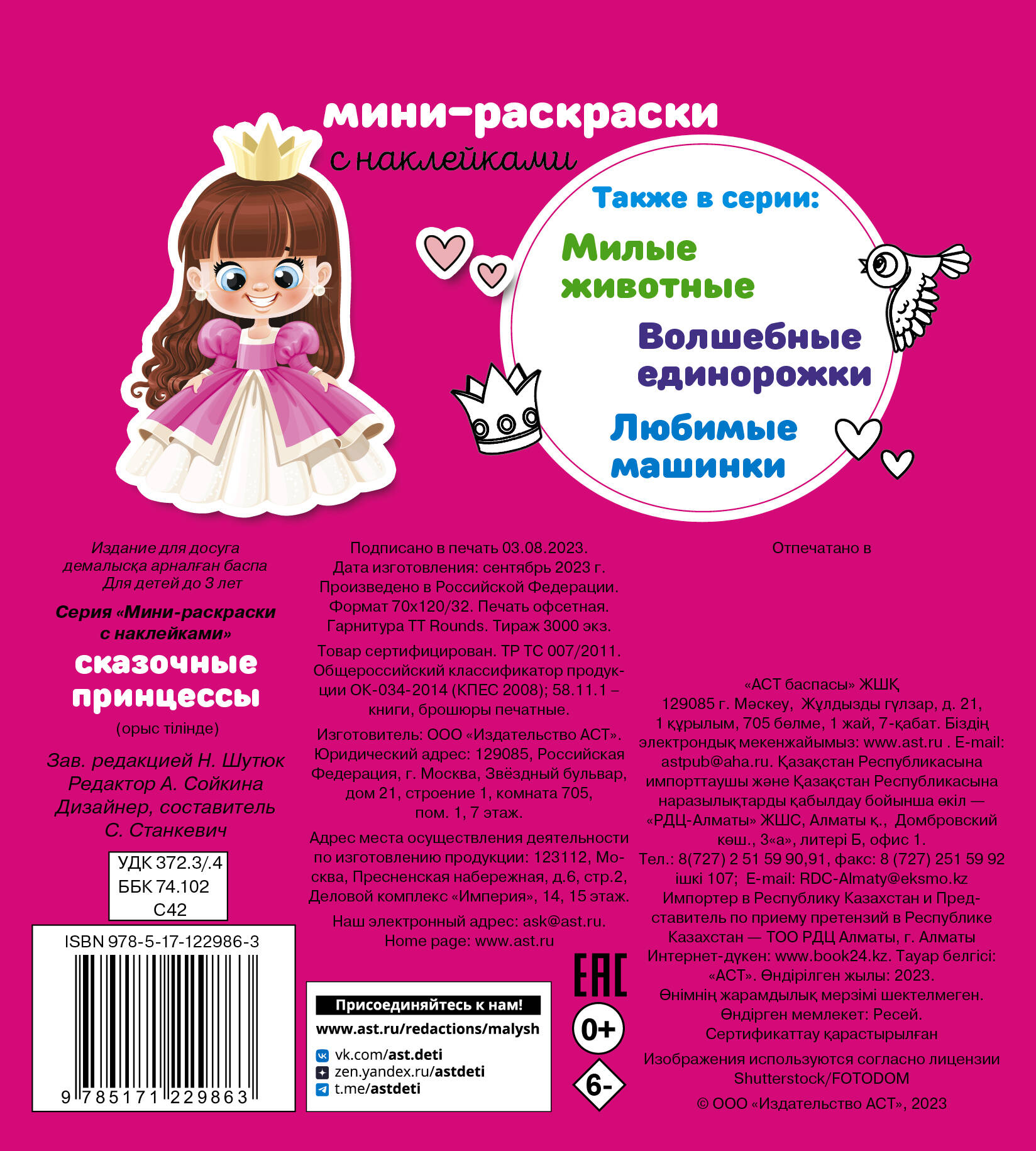 В этой раскраске тебя ждёт встреча с самыми настоящими принцессами, их друзьями и питомцами! Они знают все о придворной моде и королевских обязанностях, но в душе остаются самыми обычными девочками, которые с удовольствием расскажут тебе о себе. Скорее бери карандаши, фломастеры, краски - и вперед! А еще в этой раскраске - более 50 ярких наклеек, которыми можно украсить страницы раскраски.| Издательство | ИЗДАТЕЛЬСТВО "АСТ" |