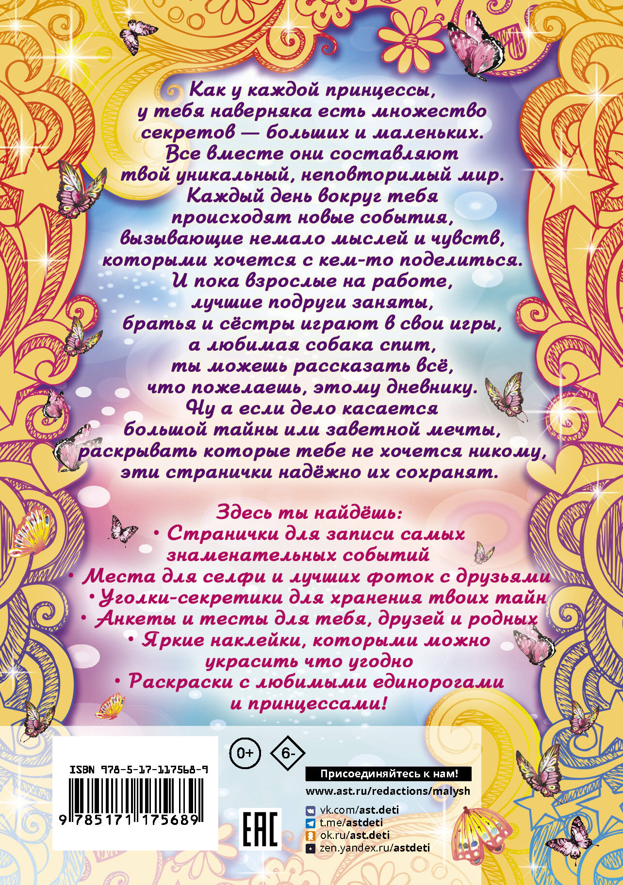 У каждой девочки есть секреты (и совсем маленькие секретики), из которых складывается её неповторимый мир. Школа, увлечения, общение с мамой и папой, братьями и сёстрами, друзьями и подружками, домашними питомцами... И всё это вызывает целую палитру чувств и оригинальные мысли обо всём на свете! Эта красочная книга тоже с секретом. Точнее, она сама -- секрет. Ты держишь в руках дневник, в который можно поместить все свои тайны и хранить их, никому не показывая. Или дать почитать избранные места тем, кому пожелаешь. А еще ты можешь ответить на вопросы анкеты о себе, своих родных и близких... Вот увидишь: пройдёт какое-то время, и не только тебе, но и им будет интересно вспомнить, каким он был -- яркий и цветной мир, навсегда запечатленный на страничках твоего дневника. Для дошкольного возраста.| Издательство | ИЗДАТЕЛЬСТВО "АСТ" |