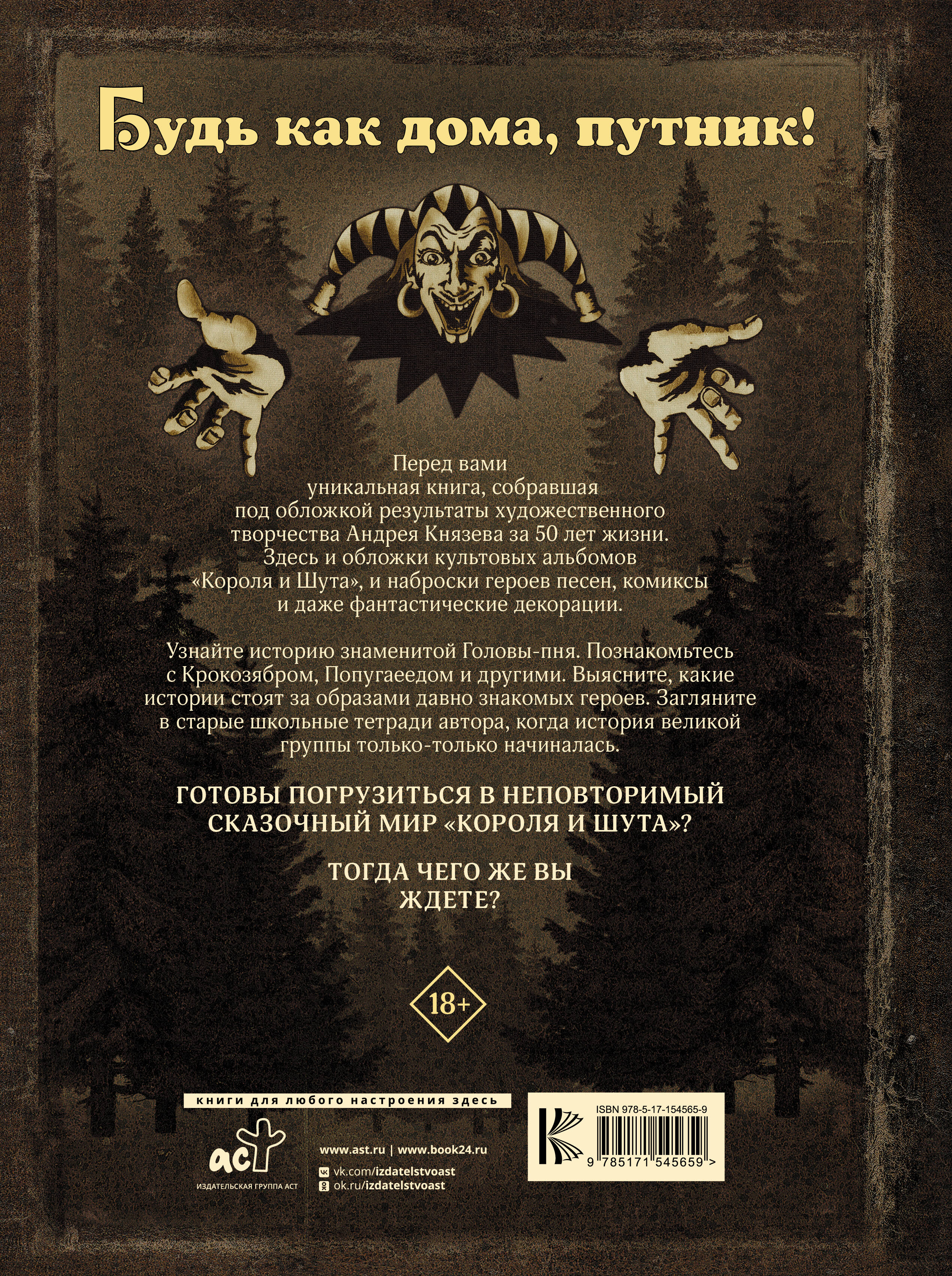 Андрей Князев - не только музыкант и поэт, но еще и талантливейший художник, иллюстрации которого стали неотъемлемой частью истории группы «Король и шут». В ярком подарочном издании «Сказочный мир Шута» Андрей представит свои художественные работы - от самых ранних до сегодняшних (2022 г.) в живописи, графике и карикатурах. В каждом разделе представлены иллюстрации определенного стиля или временного отрезка. Один из самых ценных - серия оформительских иллюстраций для «Короля и Шута», многие из которых поклонники неоднократно встречали на дисках, кассетах, афишах и постерах. Эта книга - новое знакомство с историей любимой группы и детальное погружение в созданные ею сказочные образы!| Издательство | ИЗДАТЕЛЬСТВО "АСТ" |