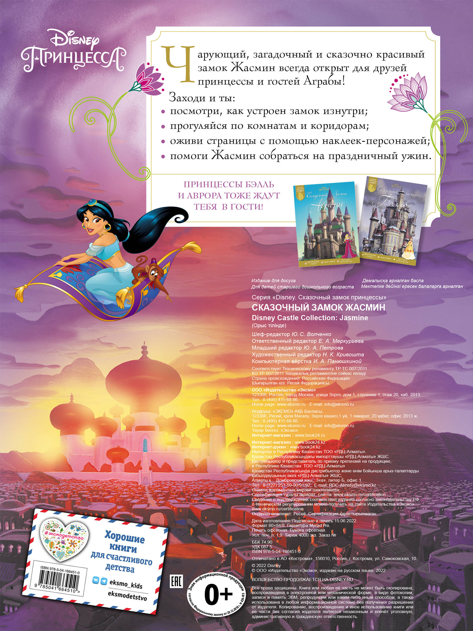 Чарующий, загадочный и сказочно красивый замок Жасмин всегда открыт для друзей принцессы и гостей Аграбы! Заходи и ты: • посмотри, как устроен замок изнутри; • прогуляйся по комнатам и коридорам; • оживи страницы с помощью наклеек-персонажей; • помоги Жасмин собраться на праздничный ужин.| Издательство | Эксмо |