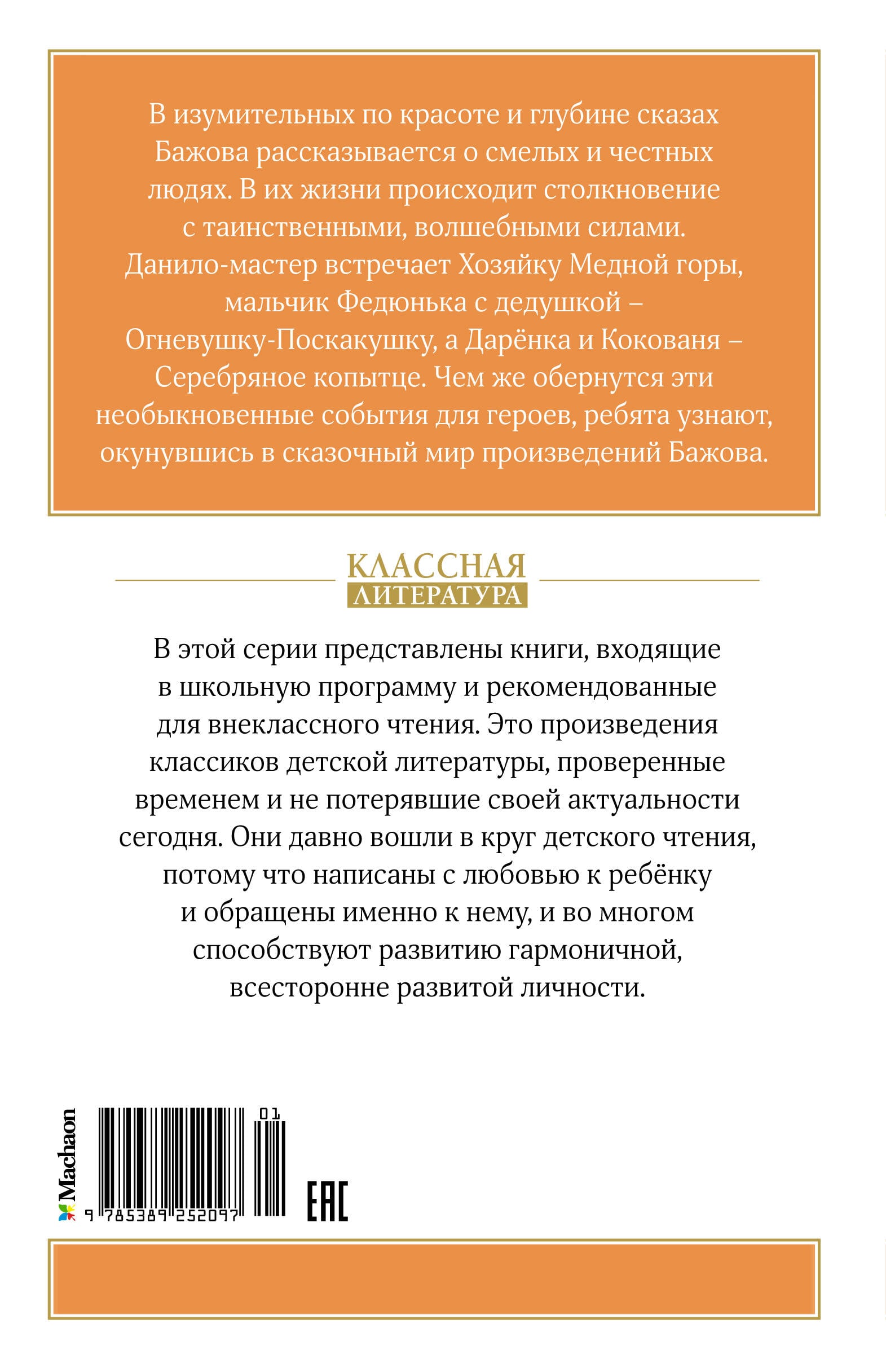 В изумительных по красоте и глубине сказах Бажова рассказывается о смелых и честных людях. В их жизни происходит столкновение с таинственными, волшебными силами. Данило-мастер встречает Хозяйку Медной горы, мальчик Федюнька с дедушкой - Огневушку-Поскакушку, а Дарёнка и Кокованя - Серебряное копытце. Чем же обернутся эти необыкновенные события для героев, ребята узнают, окунувшись в сказочный мир произведений Бажова.| Издательство | Азбука-Аттикус Издат.группа ООО |