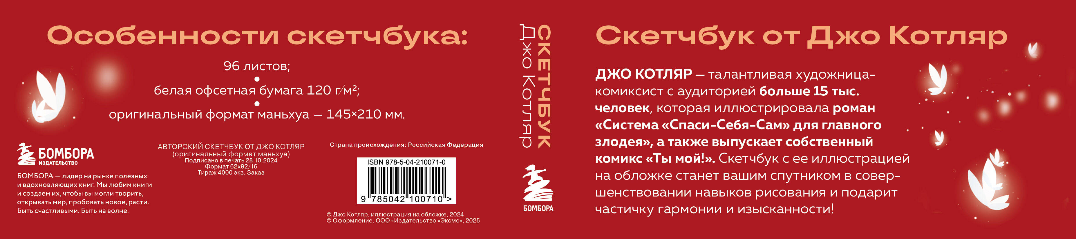 Специально для поклонников китайских новелл и маньхуа! Авторский скетчбук от Джо Котляр! Он вдохновит на создание собственной истории, со своими героями и сюжетными линиями. Джо Котляр - талантливая художница-комиксист с аудиторией больше 15 тыс. человек, которая иллюстрировала роман «Система «Спаси-Себя-Сам» для главного злодея», а также выпускает собственный комикс «Ты мой!». Ее изящные работы не только вызывают у людей эстетическое наслаждение, но и погружают в хрупкую и мимолетную красоту китайской культуры. Скетчбук с иллюстрацией художницы на обложке станет вашим спутником в совершенствовании навыков рисования и подарит частичку гармонии и изысканности. Особенности скетчбука: • Внутри 96 страниц из белой офсетной бумаги плотностью 120 мг. Можно рисовать и карандашами, и красками, и маркерами - выдержит все! • Красочная обложка в твердом переплете украшена тиснением серебряной фольгой. • Скетчбук выполнен в классическом формате маньхуа (145х210 мм), чтобы вы могли поставить его на полку к любимым историям.| Издательство | ООО "Издательство "Эксмо" |