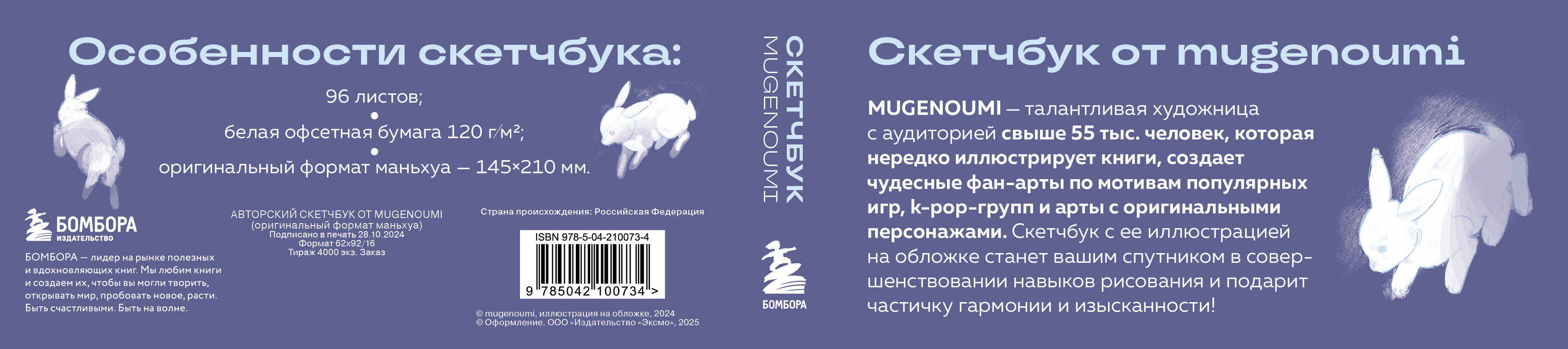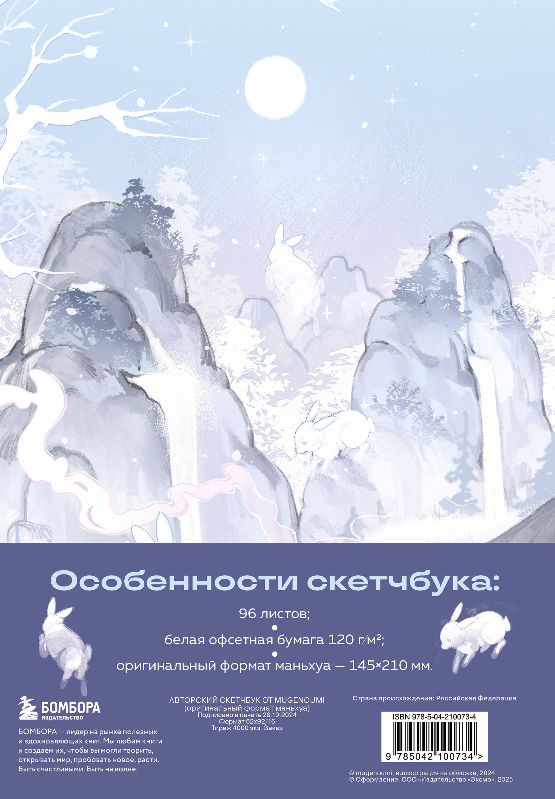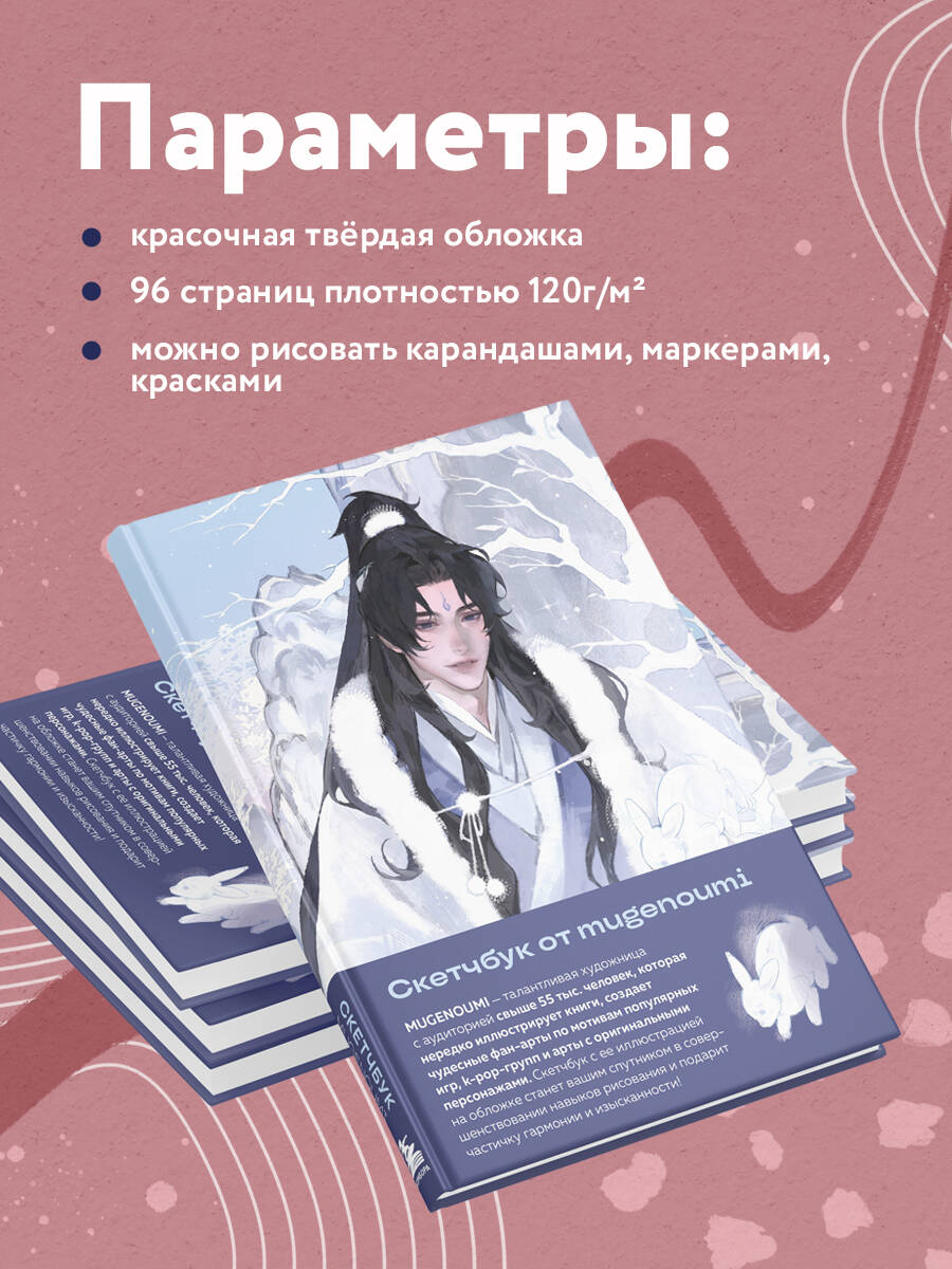 Специально для поклонников китайских новелл и маньхуа! Авторский скетчбук от mugenoumi! Он вдохновит на создание собственной истории, со своими героями и сюжетными линиями. Mugenoumi - талантливая художница с аудиторией свыше 55 тыс. человек, которая нередко иллюстрирует книги, создает чудесные фанарты по мотивам популярных игр, K-pop групп и арты с оригинальными персонажами. Ее изящные работы не только вызывают у людей эстетическое наслаждение, но и погружают в хрупкую и мимолетную красоту азиатской культуры. Скетчбук с иллюстрацией художницы на обложке станет вашим спутником в совершенствовании навыков рисования и подарит частичку гармонии и изысканности. Особенности скетчбука: • Обложку украшает иллюстрация с изящным юношей, который уединился в горах со снежными кроликами в поисках просветления. • Внутри 96 страниц из белой офсетной бумаги плотностью 120 мг. Можно рисовать и карандашами, и красками, и маркерами - выдержит все! • Скетчбук выполнен в твердом переплете в классическом формате маньхуа (145х210 мм), чтобы вы могли поставить его на полку к любимым историям.| Издательство | ООО "Издательство "Эксмо" |