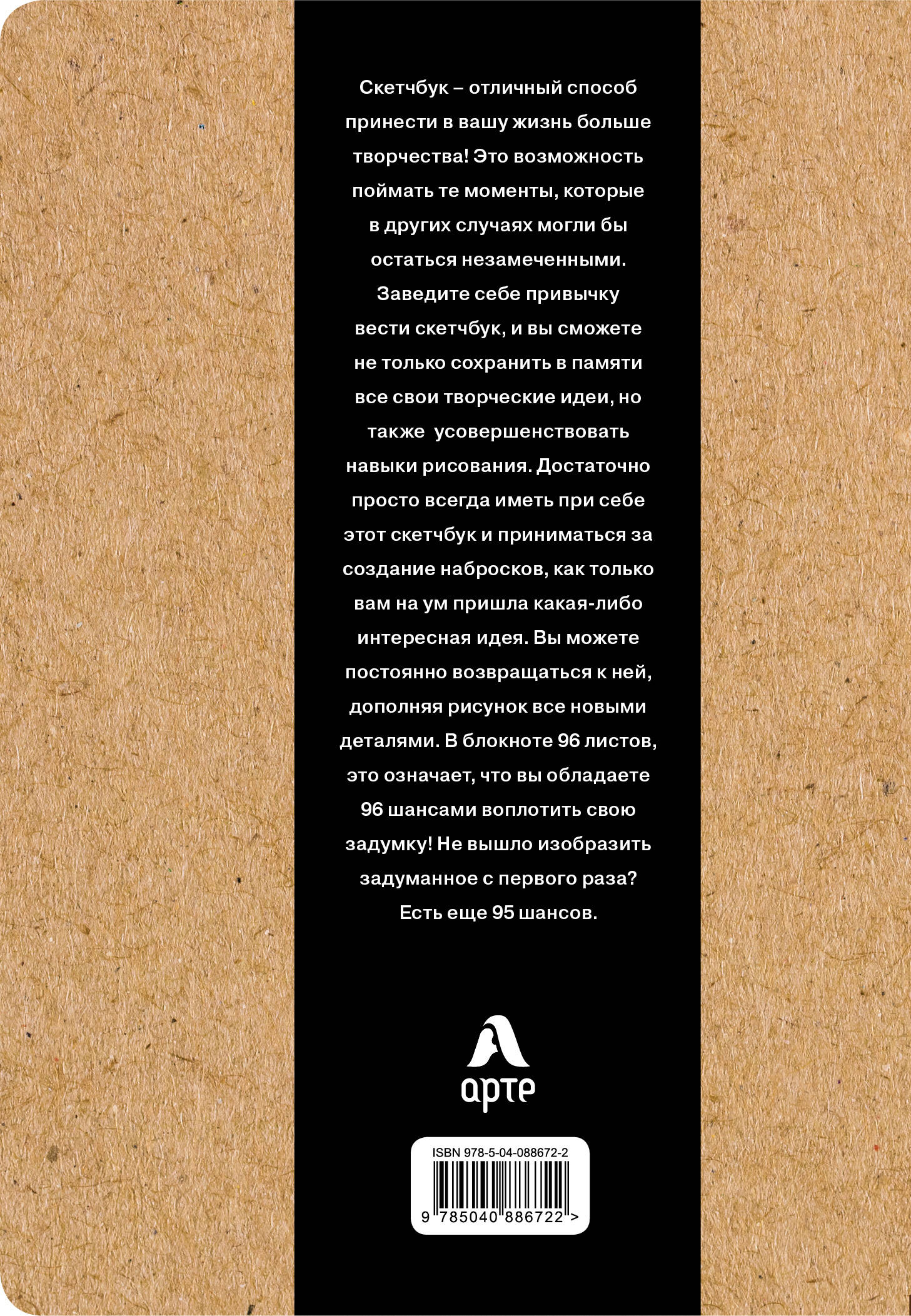 Скетчбук - это замечательный способ принести в вашу жизнь больше творчества! Это возможность поймать те моменты, которые в других случаях могли бы остаться незамеченными. К тому же, в последнее время это направление творчества находится на пике популярности. Заведите себе привычку вести скетчбук, и вы сможете не только сохранить в памяти все свои творческие идеи, но также усовершенствовать навыки рисования. Достаточно просто всегда иметь при себе этот альбом и приниматься за создание набросков, как только вам на ум пришла какая-либо интересная идея. Вы можете постоянно возвращаться к ней, дополняя рисунок все новыми деталями. В блокноте 96 листов, это означает, что вы обладаете 96-ю шансами воплотить свою задумку! Не вышло изобразить задуманное с первого раза? - есть ещё 95 шансов. Этот скетчбук - часть коллекции "Крафт - это сила. Дизайнерские блокноты" от бренда АРТЕ. Вы можете дополнить его другими аксессуарам в том же стиле. Канцелярские аксессуары АРТЕ окружат вас красотой на рабочем месте, создадут особую атмосферу спокойствия и гармонии, какой бы напряженной ни была обстановка вокруг.| Издательство | Эксмо |