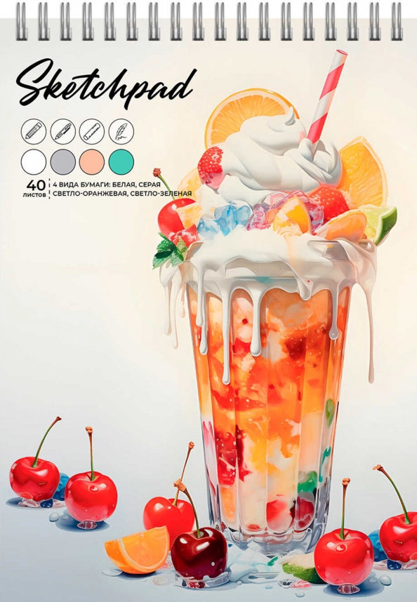 Альбом для рисования (Скетчпад) А5+ 40 л, 4 вида бумаг, арт. 67743 ДЕСЕРТ/ блок - белый офсет, зелёный офсет, оранжевый офсет, серый офсет 80 г/м?, обложка - полноцветная печать, гребень по короткой стороне, жёсткая подложка,