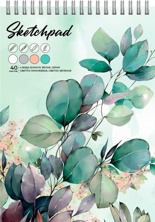 Альбом для рисования (Скетчпад) А5+ 40 л, 4 вида бумаг, арт. 67744 ЗЕЛЕНЫЕ ЛИСТЬЯ/ блок - белый офсет, зелёный офсет, оранжевый офсет, серый офсет 80 г/м?, обложка - полноцветная печать, гребень по короткой стороне, жёсткая подложка,
