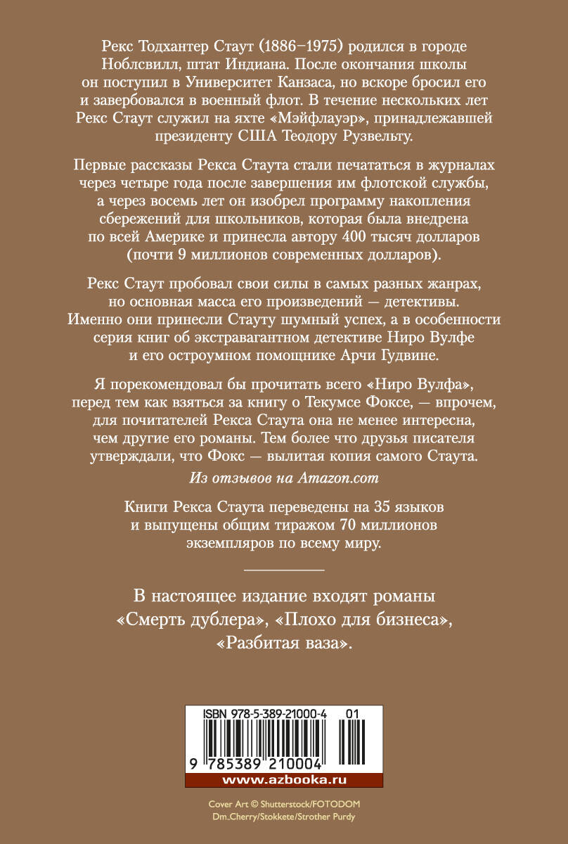 Рекс Стаут, создатель знаменитого цикла детективных произведений о Ниро Вулфе, большом гурмане, страстном любителе орхидей и одном из самых великих сыщиков, описанных когда-либо в литературе, на этот раз поручает расследование запутанных преступлений частному детективу Текумсе Фоксу, округ Уэстчестер, штат Нью-Йорк. В уединенном лесном коттедже найдено тело Ридли Торпа, финансиста с незапятнанной репутацией. Энди Грант, накануне убийства посетивший поместье Торпа и первым обнаруживший труп, обвиняется в совершении преступления. Нэнси Грант, сестра Энди, обращается к Текумсе Фоксу, чтобы тот снял с ее брата обвинение в несовершённом убийстве. Фокс принимается за расследование ("Смерть дублера"). Очень плохо для бизнеса, когда в банки с качественным продуктом кто-то неизвестный добавляет хинин. Частный детектив Эми Дункан берется за это дело, но вскоре ее отстраняют от расследования. Перед этим машина Эми случайно сталкивается с машиной Фокса - к счастью, без серьезных последствий, - и девушка делится с сыщиком своими подозрениями относительно того, кто виноват в порче продуктов. Виновником Эми считает хозяев фирмы, конкурирующей с компанией ее дяди, Артура Тингли. Девушка отправляется навестить дядю и находит его мертвым в собственном офисе... ("Плохо для бизнеса") Все началось со скрипки. Друг Текумсе Фокса, бывший скрипач, уговаривает частного детектива поучаствовать в благотворительной акции по покупке ценного инструмента для молодого скрипача-виртуоза Яна Тусара. Фокс не поклонник музыки, но вместе с другом он приходит в Карнеги-холл, чтобы послушать выступление Яна. Концерт проходит как назло неудачно, и, похоже, всему виной скрипка. Когда после концерта Фокс с товарищем спешат за кулисы, чтобы утешить Яна, они обнаруживают скрипача мертвым - он застрелился на глазах у свидетелей, а скрипка в суматохе пропала ("Разбитая ваза").| Издательство | Издательство АЗБУКА ООО |