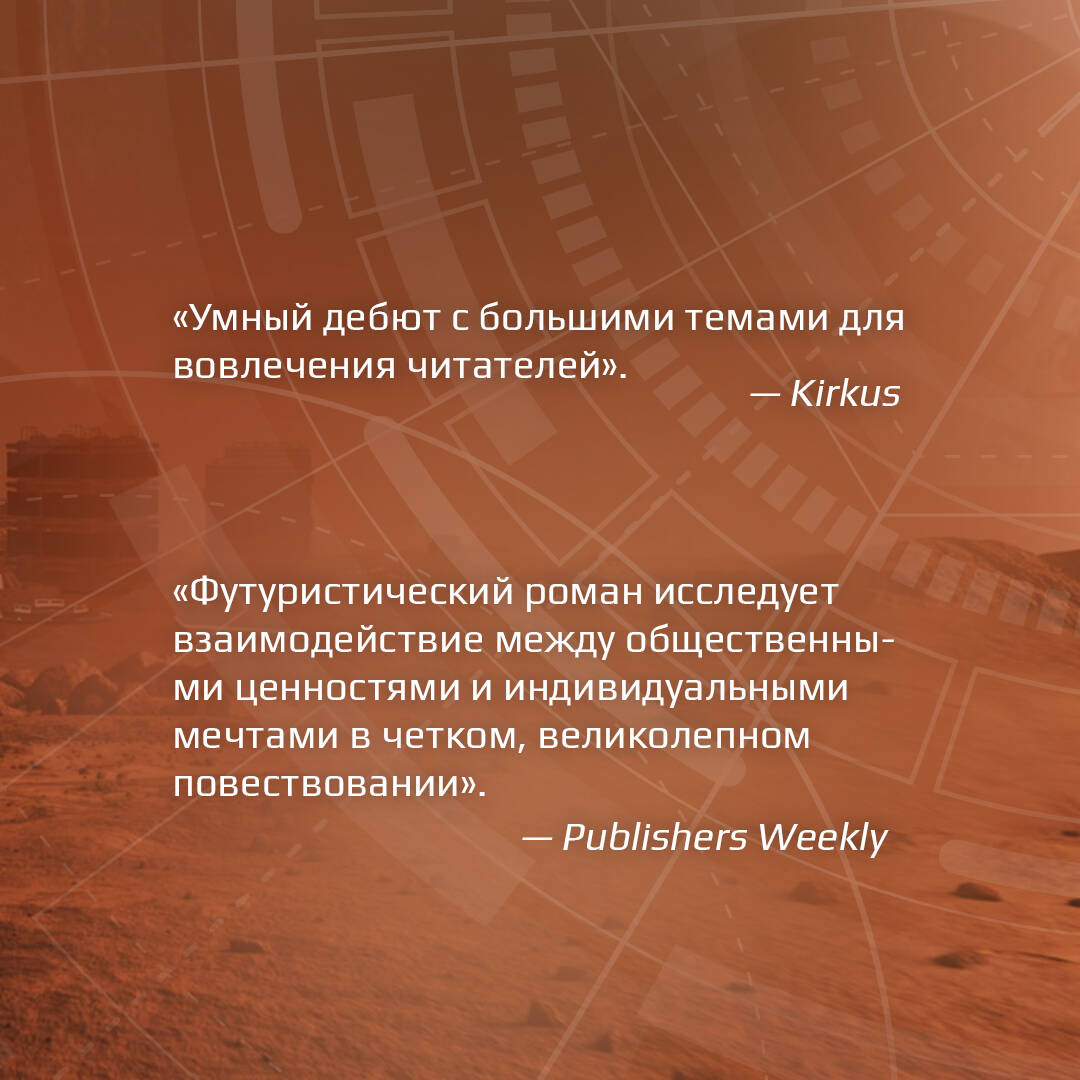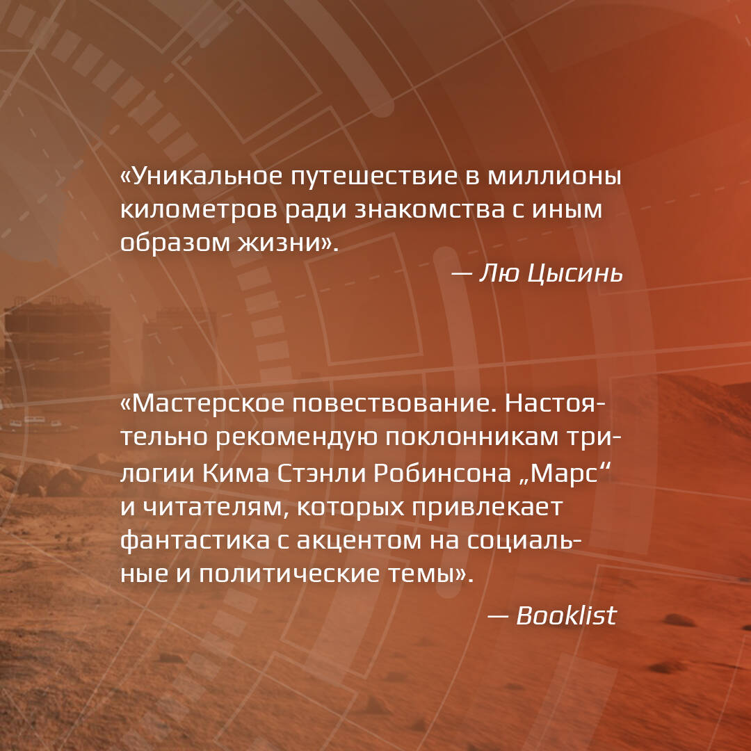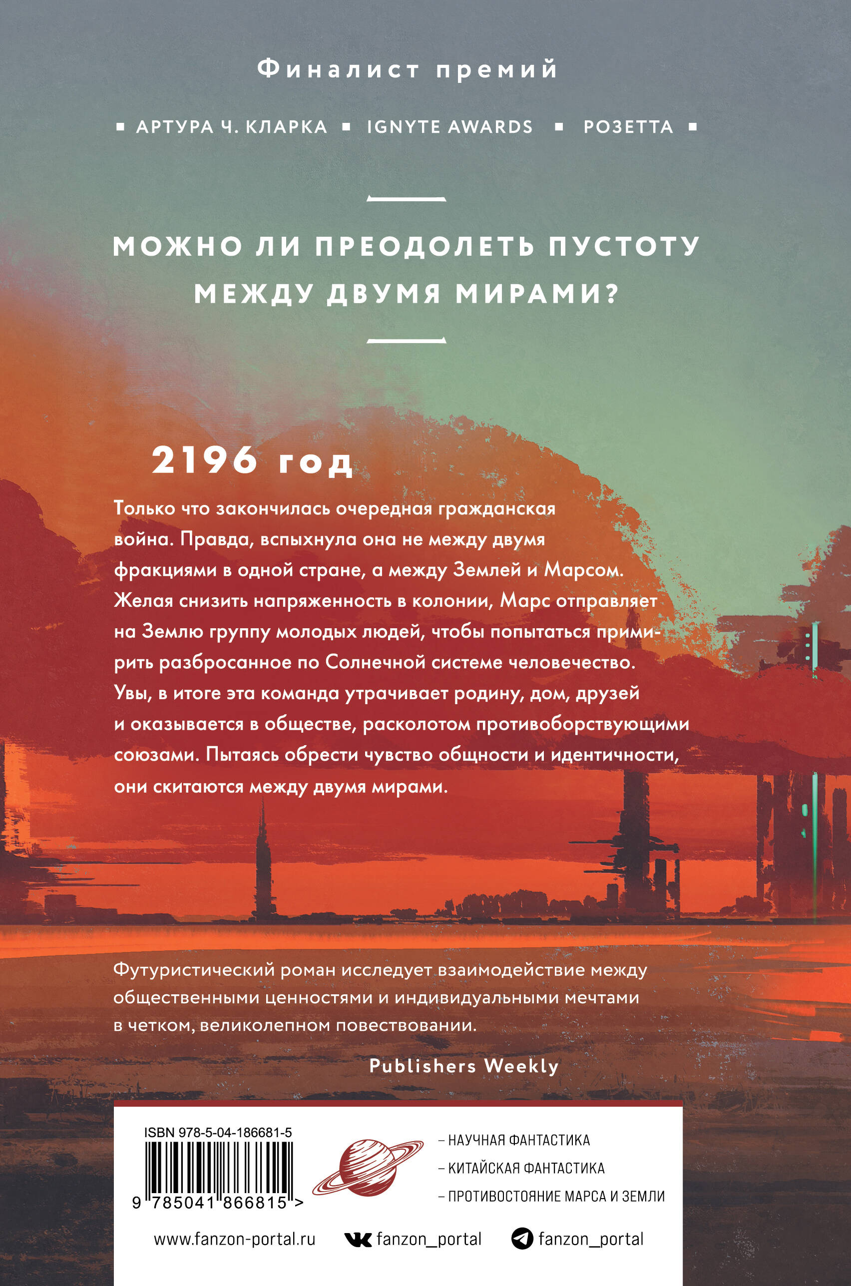 Премия Артура Ч. Кларка, Ignyte Awards, «Розетта». Выбор New York Times и Lit Hub среди ожидаемых новинок. Спустя столетие после того, как марсианская колония объявила о своей независимости, основала Марсианскую республику и начала войну с Землей, группа молодых людей отправляется в качестве делегации с Красной планеты, чтобы попытаться примирить два мира, несовместимых идеологически, экономически и социально. Но когда они возвращаются домой, то не могут предложить никакого решения для мирного сосуществования. Почти сразу же переговоры между Марсом и Землей прерываются, и политики вспоминают старую вражду. После поездки на Землю девушка с Марса ставит под сомнение свою верность и пытается найти истину среди паутины лжи, сотканной группировками на обеих планетах. Если она потерпит неудачу, все, что она когда-либо любила, может исчезнуть. Роман о взрослении, ощущении неопределенности будущего и невозможности почувствовать себя дома, в какой бы точке вселенной ты ни находился. «Уникальное путешествие в миллионы километров ради знакомства с иным образом жизни». - Лю Цысинь «Умный дебют с большими темами для вовлечения читателей». - Kirkus «Мастерское повествование. Настоятельно рекомендую поклонникам трилогии Кима Стэнли Робинсона "Марс" и читателям, которых привлекает фантастика с акцентом на социальные и политические темы». - Booklist «Футуристический роман исследует взаимодействие между общественными ценностями и индивидуальными мечтами в четком, великолепном повествовании». - Publishers Weekly «В неторопливом, рассуждающем повествовании автор проводит увлекательное и беспристрастное исследование двух очень разных, но в одинаковой степени возможных форм развития будущего». - Guardian