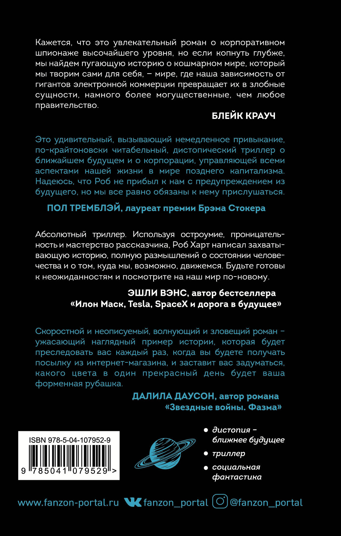 Глобальное потепление превратило мир в высохшую пустыню с городами-призраками, но бизнесмен-футурист Гибсон Уэллс придумал, как спасти человечество, основав компанию Облако. Облако дает работу, жилье и надежду. Пакстон потерял все, и его шанс - получить работу в Облаке. Цинния тоже ищет там работу, но ее цели иные. Она должна выполнить задание, за которое щедро платит неизвестный заказчик. Картинки рекламных роликов идеальны, но стальные тиски системы контролируют каждый шаг. Что же прячется за широкой улыбкой Гибсона Уэллса, возомнившего себя новым пророком и хозяином мира сего? «Захватывающий роман, из-за которого вы забудете о любимых стриминговых сервисах на несколько ночей… Большой Брат встречает Большой Бизнес…» - Стивен Кинг «Это удивительный, вызывающий немедленное привыкание, по-крайтоновски читабельный, дистопический триллер о ближайшем будущем и о корпорации, управляющей всеми аспектами нашей жизни в мире позднего капитализма. Надеюсь, что Роб не прибыл к нам с предупреждением из будущего, но мы все равно обязаны к нему прислушаться». - Пол Тремблэй, лауреат премии Брэма Стокера «Кажется, что это увлекательный роман о корпоративном шпионаже высочайшего уровня, но если копнуть глубже, мы найдем пугающую историю о кошмарном мире, который мы творим сами для себя, - мире, где наша зависимость от гигантов электронной коммерции превращает их в злобные сущности, намного более могущественные, чем любое правительство». - Блейк Крауч «Абсолютный триллер. Используя остроумие, проницательность и мастерство рассказчика, Роб Харт написал захватывающую историю, полную размышлений о состоянии человечества и о том, куда мы, возможно, движемся. Будьте готовы к неожиданностям и посмотрите на наш мир по-новому». - Эшли Вэнс, автор бестселлера «Илон Маск: Tesla, SpaceX и дорога в будущее» «Скоростной и неописуемый, волнующий и зловещий роман - ужасающий наглядный пример истории, которая будет преследовать вас каждый раз, когда вы будете получать посылку из интернет-магазина, и заставит вас задуматься, какого цвета в один прекрасный день будет ваша форменная рубашка». - Далила Даусон, автор «Звездные войны. Фазма»| Издательство | ООО "Издательство "Эксмо" |