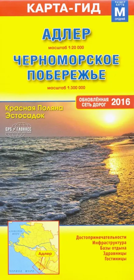 На карте Адлер (М 1:17 000) показаны угловые адреса кварталов, выделены основные и транзитные проезды по городу, даны объекты социально-культурного значения, места отдыха. Приведен полный перечень улиц города. На карте Черноморского побережья (М 1:300 000) отображены населенные пункты, границы муниципальных образований, автомобильные дороги с указанием европейской нумерацией, железные дороги, а также все достопримечательности (питомники, пещеры, дольмены, водопады и проч.)