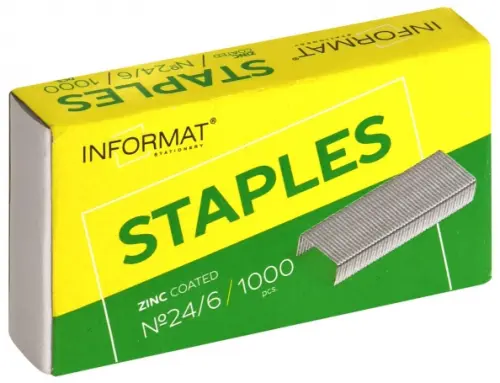 Скобы для степлера №24/6, предназначены для сшивания до 25 листов бумаги. Выполнены из оцинкованной стали. Отличная заточка позволяет с легкостью пробивать листы. В картонной коробке 1000 штук.