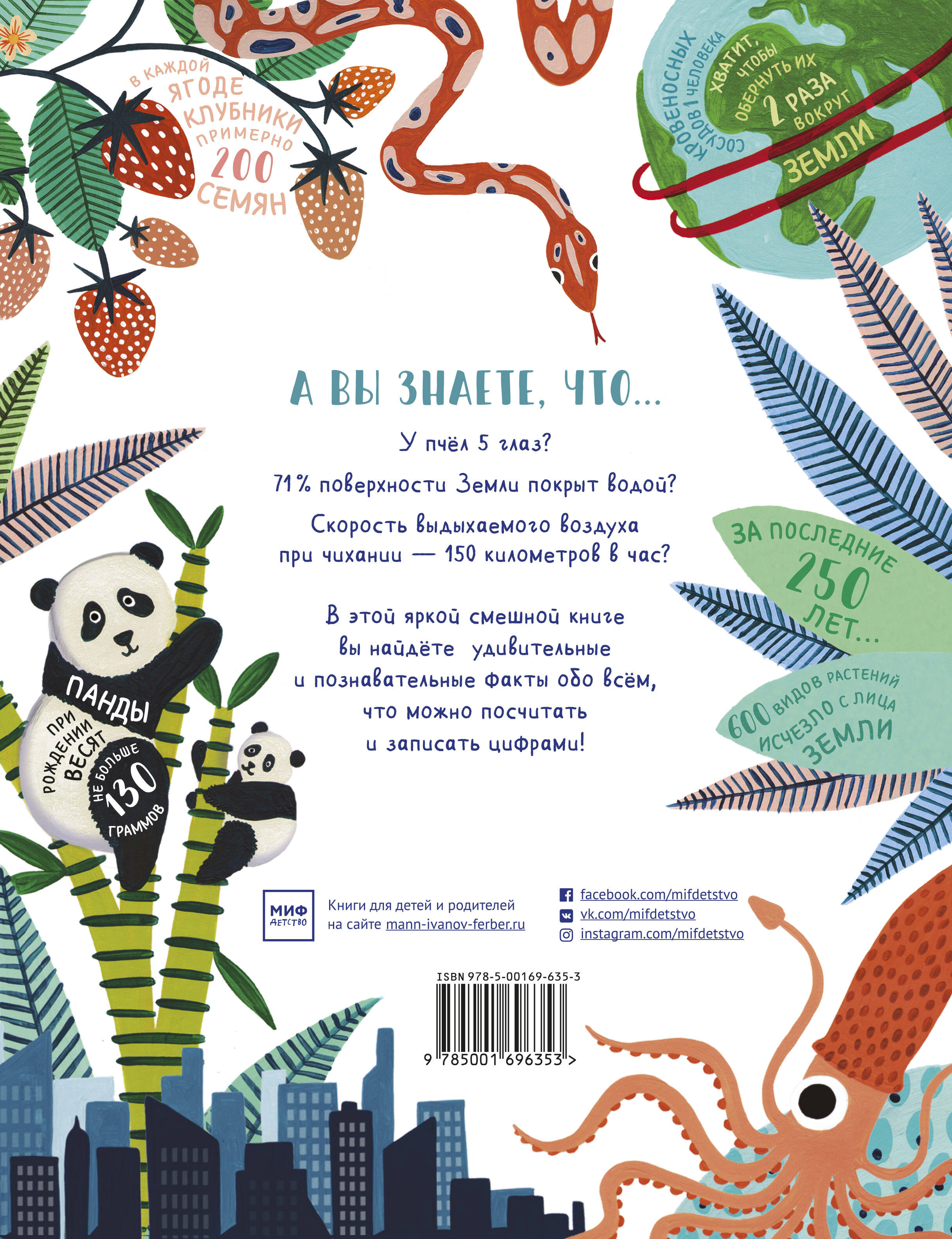 Веселая и яркая энциклопедия обо всем на свете в цифрах. В ней можно найти все самые интересные ответы на вопрос "Сколько?" Знали ли вы, что у гепарда больше 2000 пятен? А у вас на лице 43 мускула? В книге собрано множество удивительных фактов (больше 350!) на самые разные темы: животные, растения, насекомые, еда, страны, архитектура и роботы, и даже рыцари и пираты. Каждый разворот посвящен одной теме. Как пользоваться книгой: Дать любознательному ребенку и потерять его на пару часов. Можно играть в угадайку: один задает вопрос, другой пытается отгадать цифру. Отлично подойдет для досуга на детских праздниках - кто больше фактов назовет, получит приз! Читать всей семьей, веселиться и узнавать новое. Для кого эта книга: Для младших и средних школьников. Для любознательного ребенка, интересующегося необычными фактами. Для детей и их родителей.| Издательство | Манн, Иванов и Фербер |