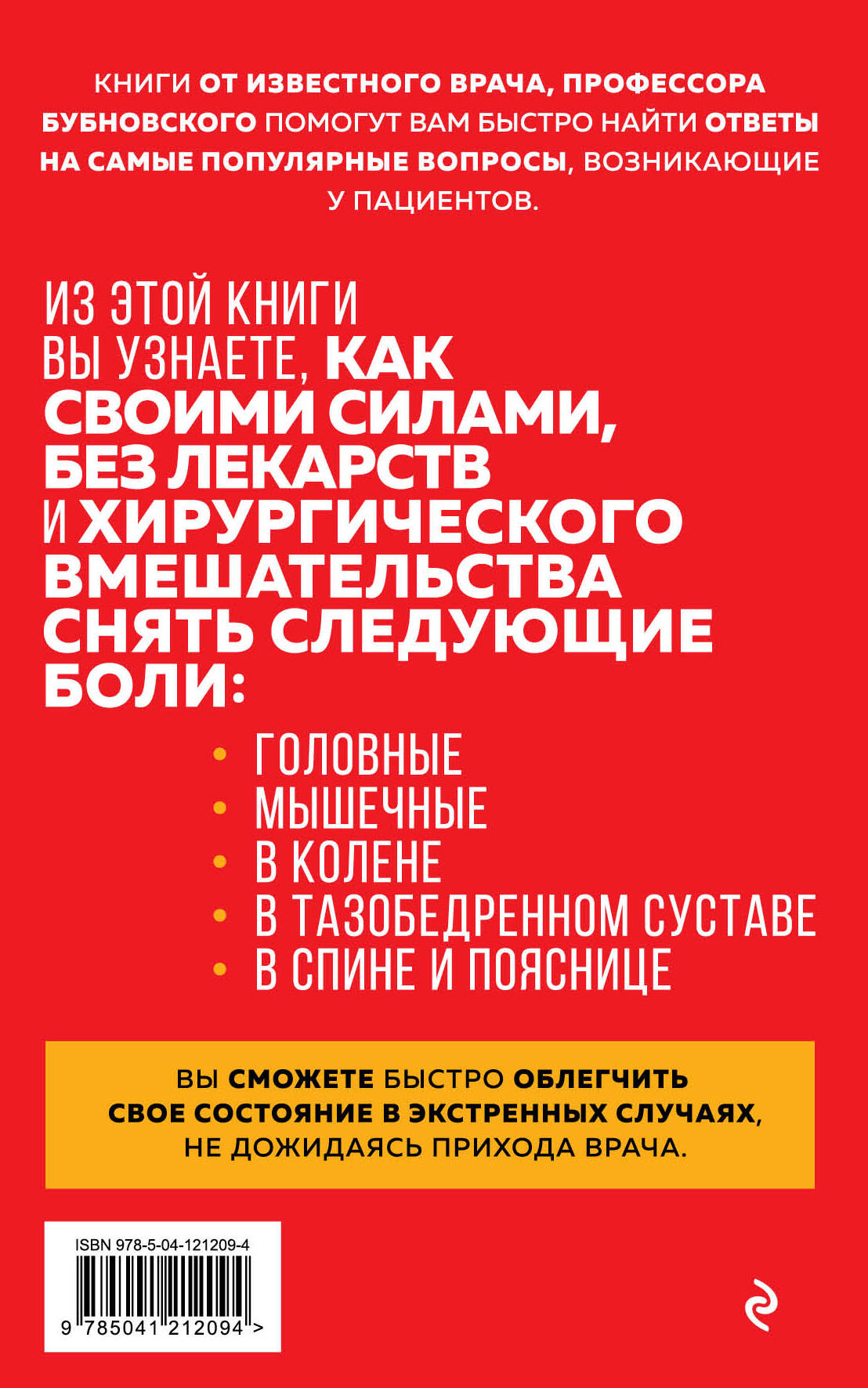 Новая книга доктора Сергея Бубновского, профессора, доктора медицинских наук, посвящена неотложной помощи при острых болях без лекарств и оперативного вмешательства. Привычка при каждом случае вызывать «Скорую помощь» или принимать лекарственные препараты, часто наобум, в будущем может стоить человеку активности, здоровья и даже жизни, считает доктор Бубновский. Люди не понимают принципов работы организма, полагаясь на врачей «Скорой», которые могут в нужный момент не оказаться рядом. Как понять источник боли и быстро снять ее? Как избежать ненужных операций? Что такое здоровый образ жизни - по мнению профессора медицины, а не инстаграм-тренеров? В книге доктор Бубновский раскрывает, как собственными силами, без лекарств и хирургических вмешательств, снять головную, мышечную и суставную боль. Незаменимая книга, которая дает практические ответы на главные вопросы: как жить без боли, сохранить организм и жить активной жизнью как можно дольше.| Издательство | ООО "Издательство "Эксмо" |