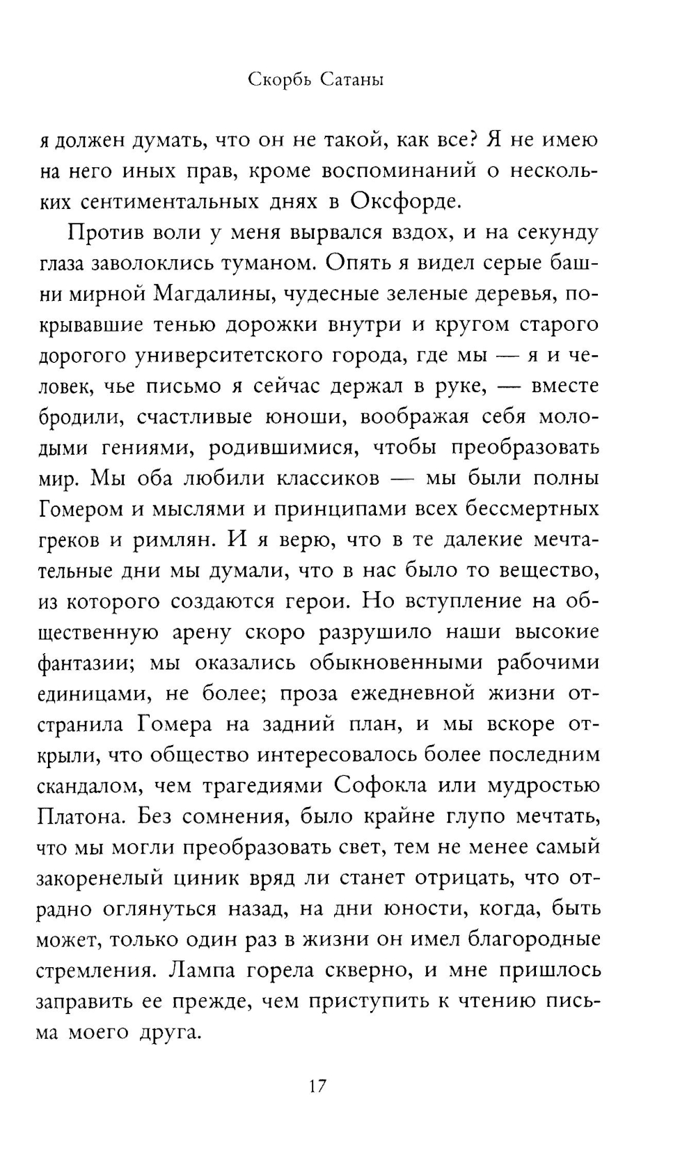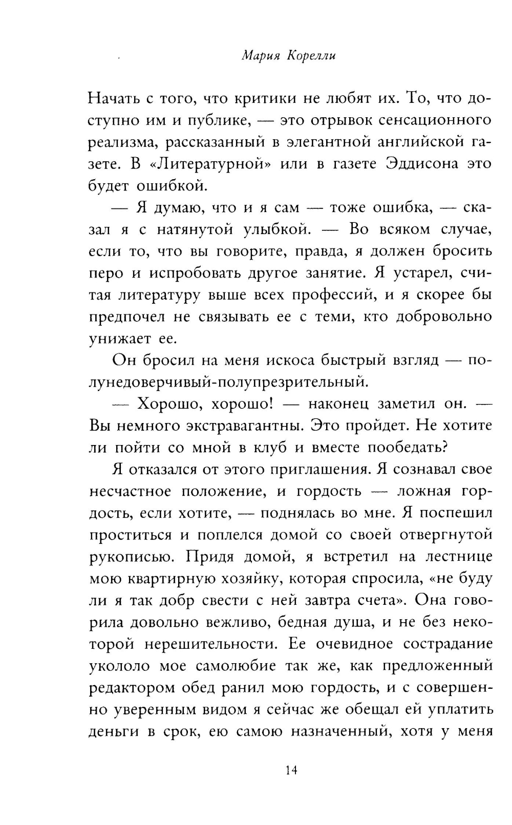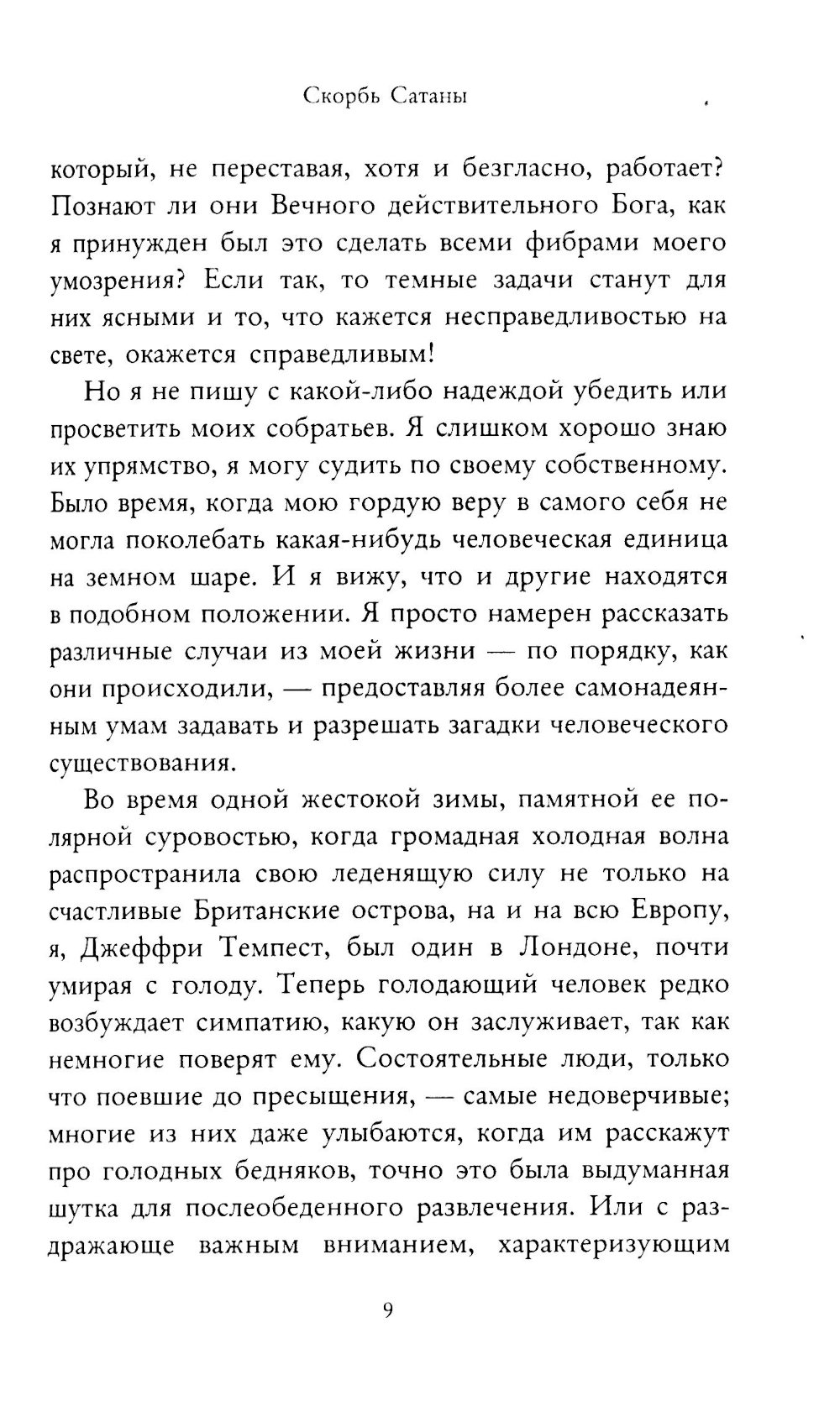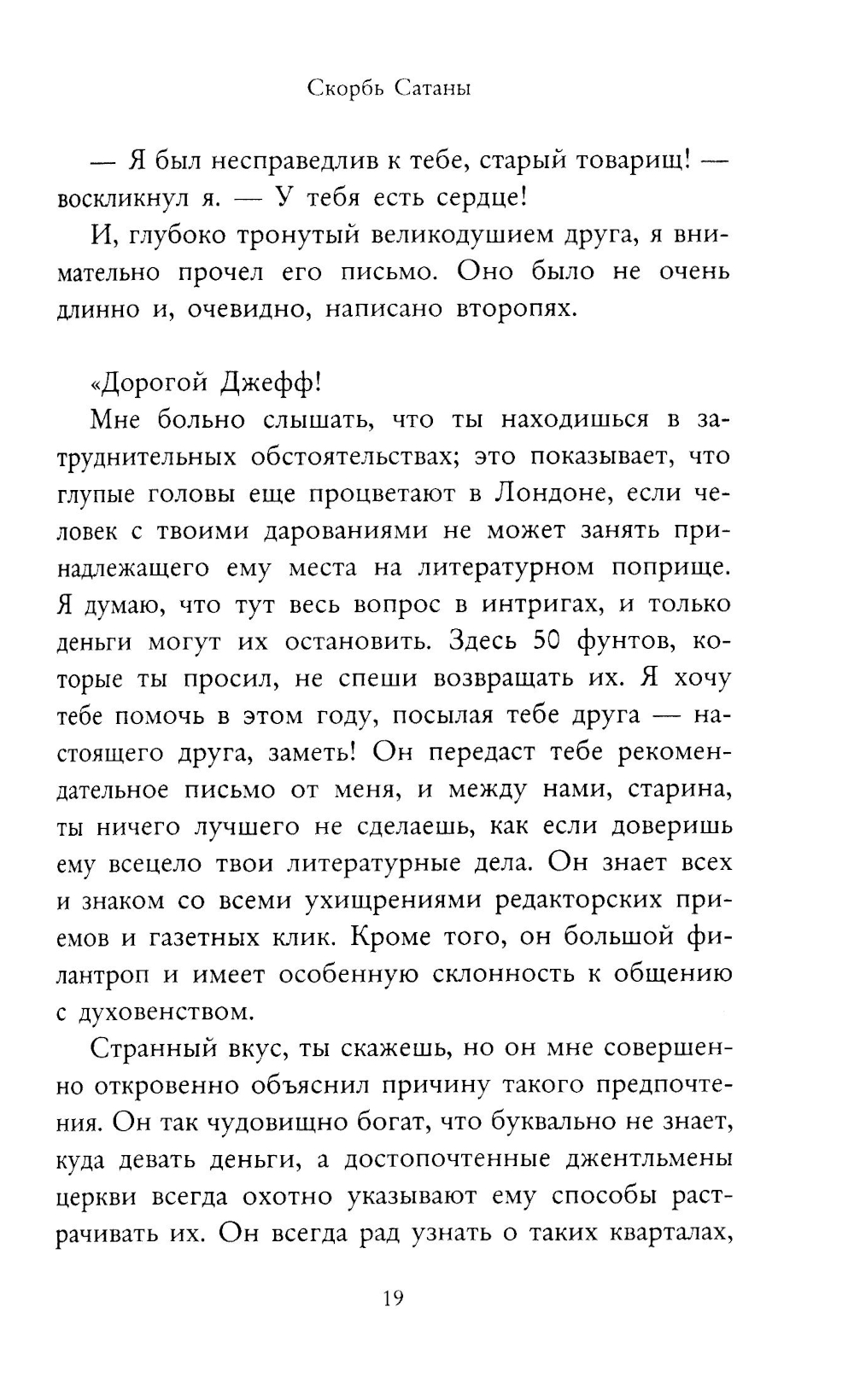 Роман «Скорбь Сатаны» увидел свет в 1895 году и стал одним из самых ярких британских бестселлеров - только за первую неделю было продано более 25 000 экземпляров книги. Унизительная, тягостная бедность сводит с ума талантливого писателя Джеффри Темпеста. Он получил «нежное воспитание» и университетское образование, считал себя джентльменом, а литературу - своим призванием, но посреди суровой зимы, голодая и дрожа от холода, не мог больше сосредоточиться на работе. В час отчаяния на пороге его комнатушки появляется благородный князь Лючио Риманец с удивительной вестью о нежданном наследстве. Пять миллионов фунтов стерлингов и новый друг знатных кровей кардинально меняют жизнь молодого литератора - высшее общество, признание критиков, брак с самой завидной невестой Англии... Но посреди славы и удовольствий день за днем нарастает тяжесть смутных предчувствий. Кто же этот великолепный господин Риманец, так легко идущий по жизни, и чем обернется для Джеффри Темпеста выбор сиюминутного, обманчивого счастья?| Издательство | Metamorphoses |