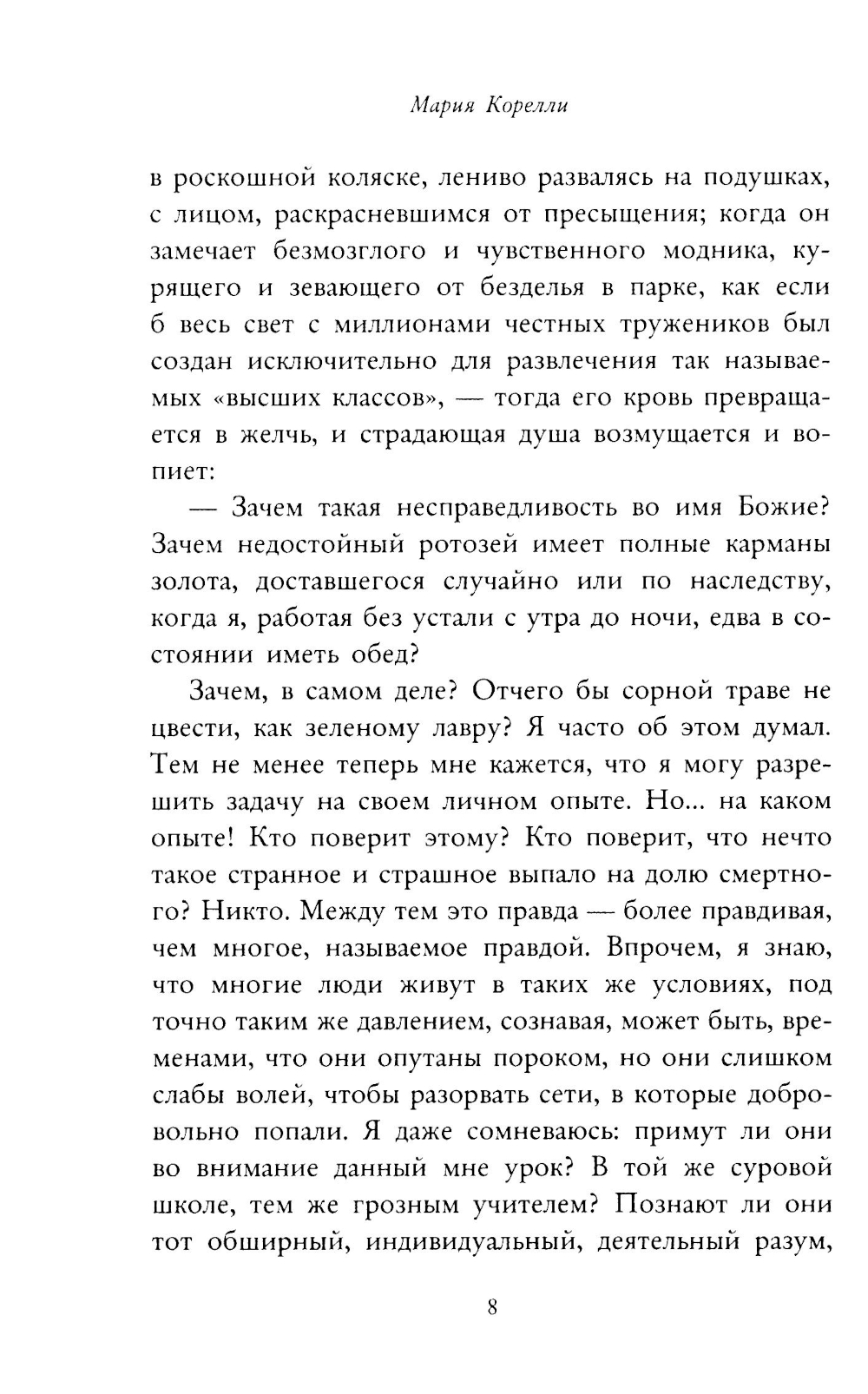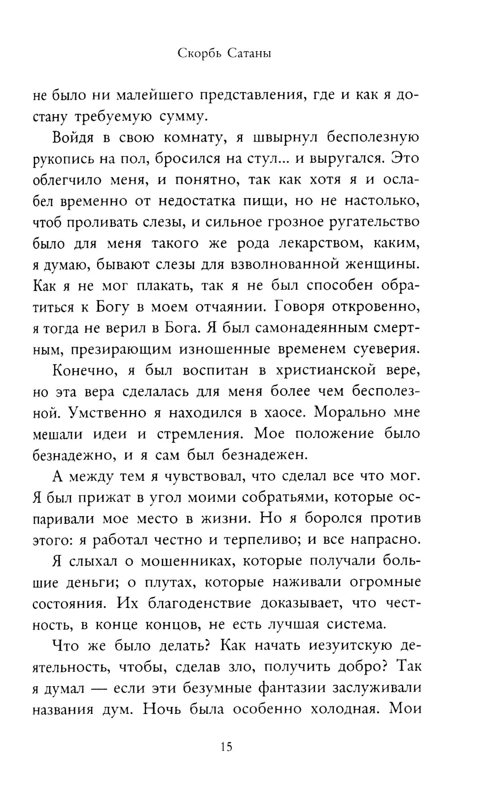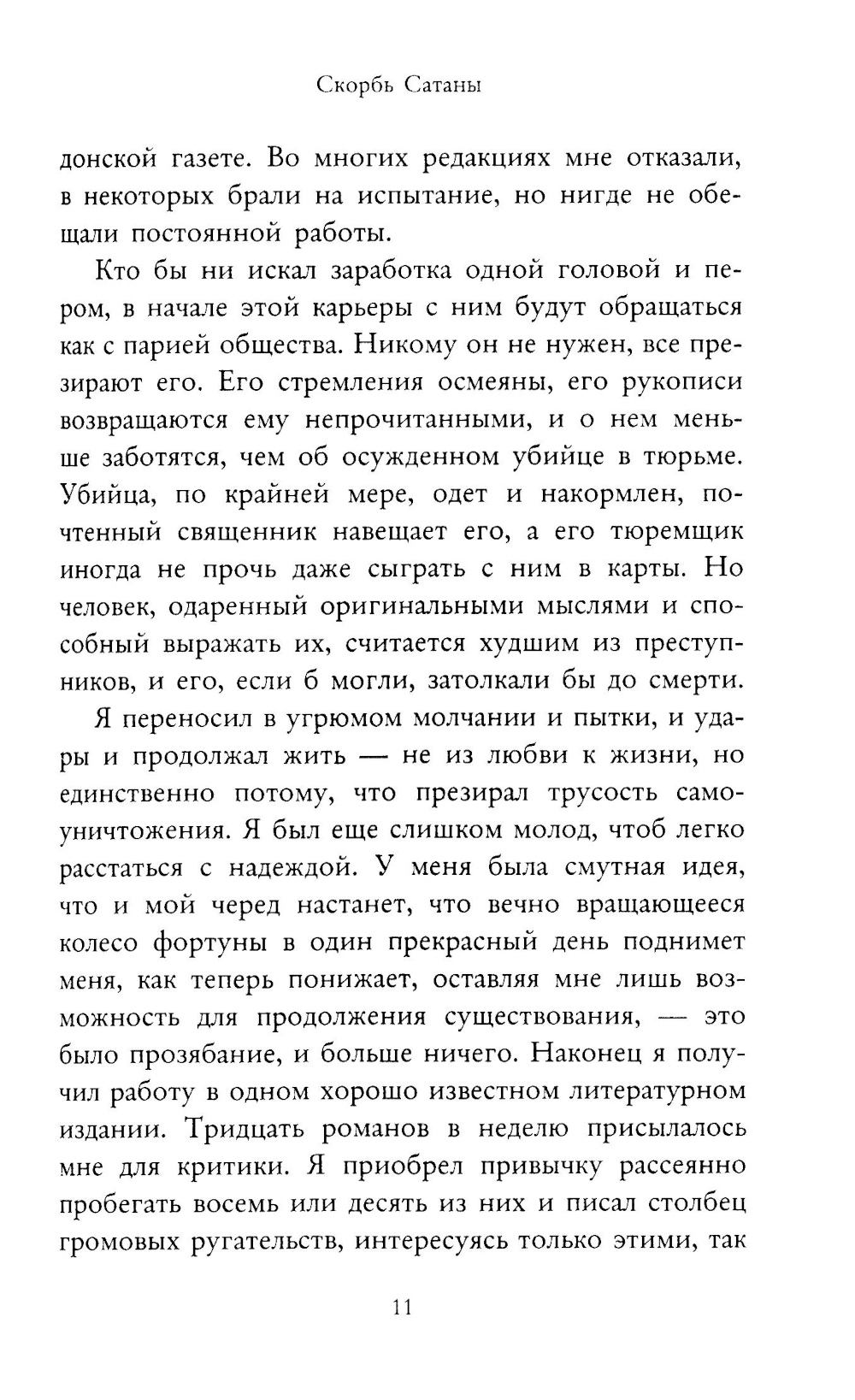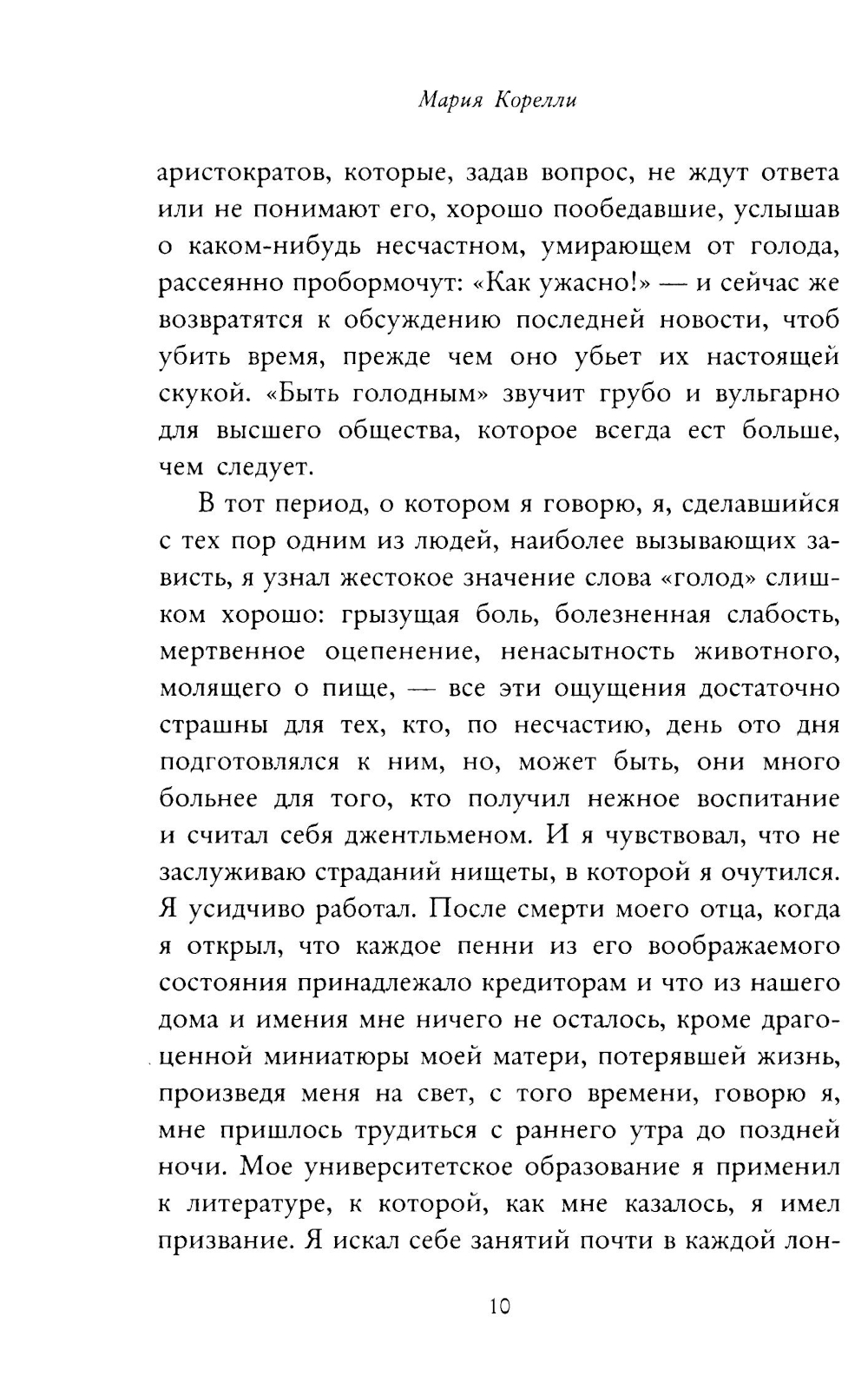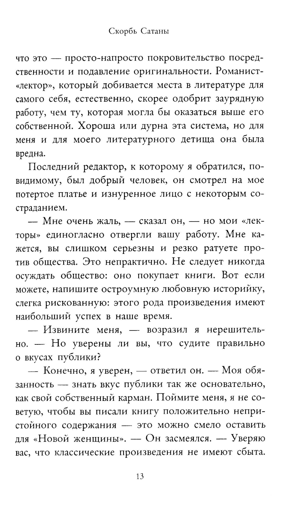 Роман «Скорбь Сатаны» увидел свет в 1895 году и стал одним из самых ярких британских бестселлеров - только за первую неделю было продано более 25 000 экземпляров книги. Унизительная, тягостная бедность сводит с ума талантливого писателя Джеффри Темпеста. Он получил «нежное воспитание» и университетское образование, считал себя джентльменом, а литературу - своим призванием, но посреди суровой зимы, голодая и дрожа от холода, не мог больше сосредоточиться на работе. В час отчаяния на пороге его комнатушки появляется благородный князь Лючио Риманец с удивительной вестью о нежданном наследстве. Пять миллионов фунтов стерлингов и новый друг знатных кровей кардинально меняют жизнь молодого литератора - высшее общество, признание критиков, брак с самой завидной невестой Англии... Но посреди славы и удовольствий день за днем нарастает тяжесть смутных предчувствий. Кто же этот великолепный господин Риманец, так легко идущий по жизни, и чем обернется для Джеффри Темпеста выбор сиюминутного, обманчивого счастья?| Издательство | Metamorphoses |