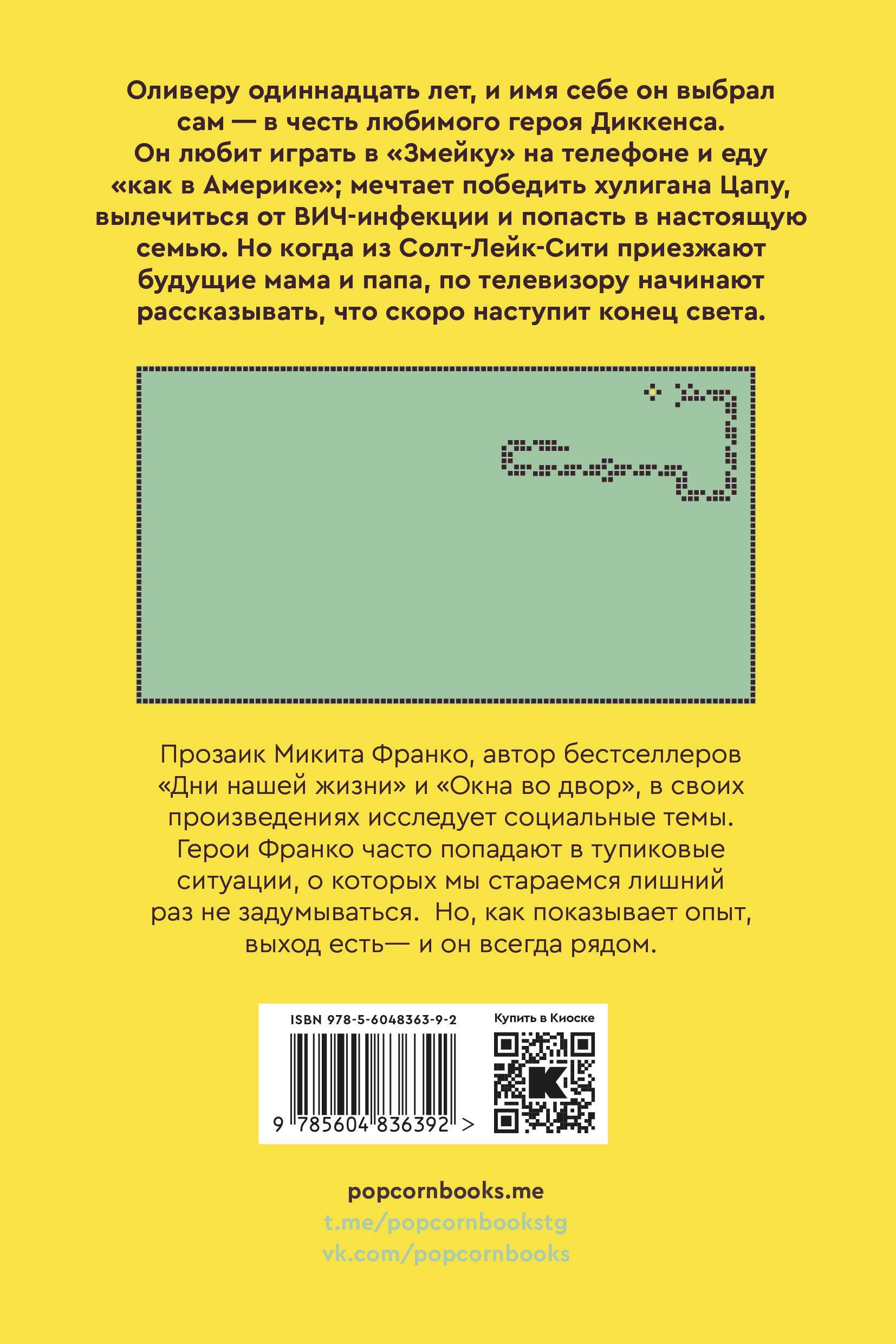 Оливеру одиннадцать лет, и имя себе он выбрал сам, в честь любимого героя Диккенса. Он любит играть в «Змейку» на телефоне и еду «как в Америке»; мечтает победить хулигана Цапу, вылечиться от ВИЧ-инфекции и попасть в настоящую семью. Но когда из Солт-Лейк-Сити приезжают будущие мама и папа, по телевизору начинают рассказывать, что скоро наступит конец света. Прозаик Микита Франко, автор бестселлеров «Дни нашей жизни» и «Окна во двор», в своих произведениях исследует социальные темы. Герои Франко часто попадают в тупиковые ситуации, о которых мы стараемся лишний раз не задумываться. Но как показывает опыт - выход есть, и он всегда рядом.| Издательство | ИНДИВИДУУМ ПРИНТ ООО |