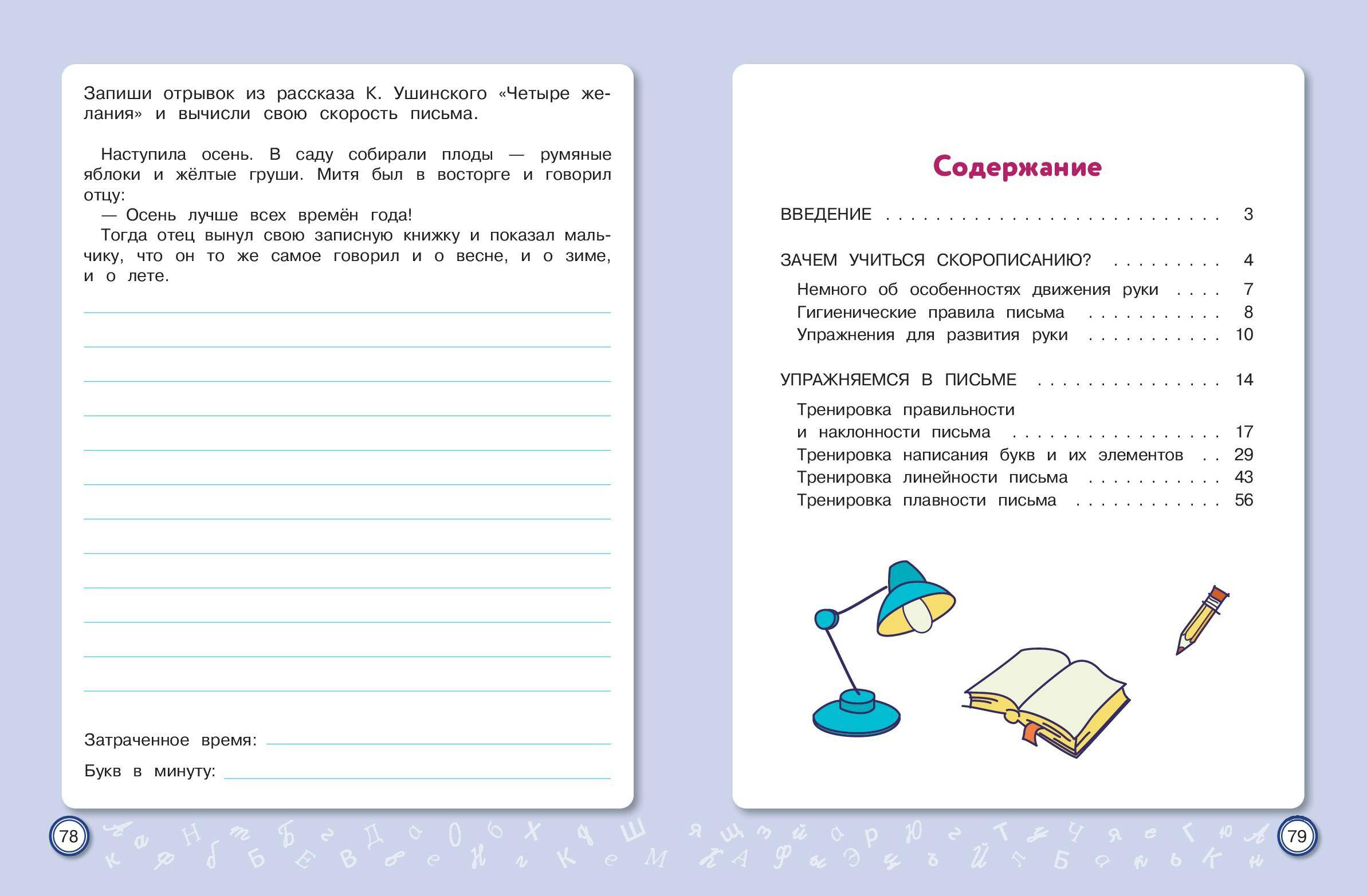 Письмо от руки - один из самых эффективных способов развития не только мелкой моторики, но и устной речи, памяти, интеллекта. Курс чистописания в начальной школе сегодня сократился до минимума. У младших школьников значительно возросла доля клавиатурного письма и работы с сенсорными устройствами. По этим причинам у них очень часто отмечается ухудшение почерка. Неправильное и медленное написание букв и их соединений приводит к проблемам не только с орфографией, но и с изложением своих мыслей, поскольку письмо - это тоже форма речи. В тренажёре представлены уникальные авторские задания по скорописанию, отвечающие требованиям времени. Научившись писать быстро и красиво, младший школьник избавится от проблем с изложением своих мыслей как на письме, так и в устной форме.| Издательство | ООО "Издательство "Эксмо" |