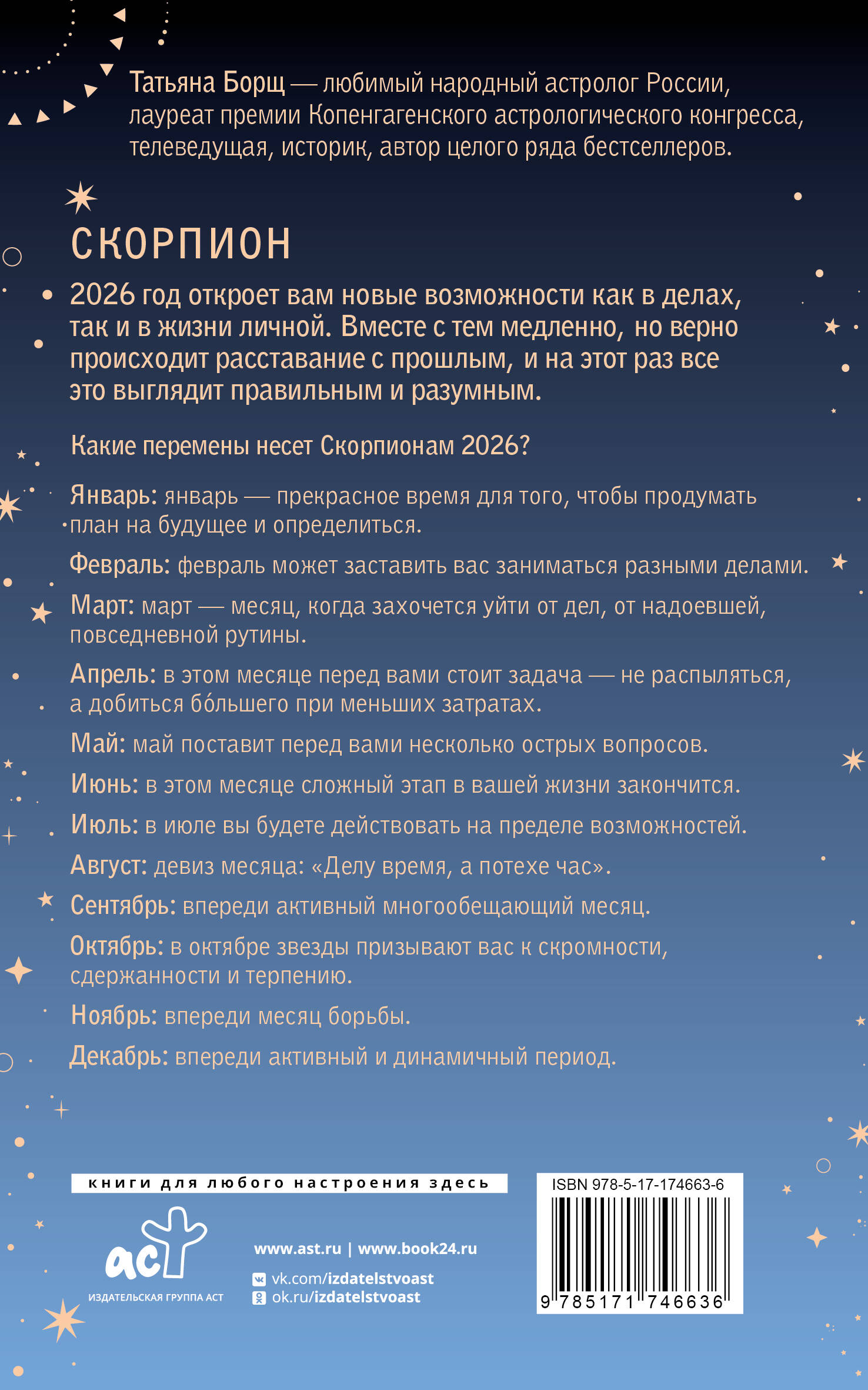 Татьяна Борщ - любимый народный астролог России, лауреат премии Копенгагенского астрологического конгресса, телеведущая, историк, автор целого ряда бестселлеров. 2026 год откроет вам новые возможности как в делах, так и в жизни личной. Вместе с тем медленно, но верно происходит расставание с прошлым, и на этот раз все это выглядит правильным и разумным. Какие перемены несет Скорпионам 2026? Январь: январь - прекрасное время для того, чтобы продумать план на будущее и определиться. Февраль: февраль может заставить вас заниматься разными делами. Март: март - месяц, когда захочется уйти от дел, от надоевшей, повседневной рутины. Апрель: в этом месяце перед вами стоит задача - не распыляться, а добиться бо́льшего при меньших затратах. Май: май поставит перед вами несколько острых вопросов. Июнь: в этом месяце сложный этап в вашей жизни закончится. Июль: в июле вы будете действовать на пределе возможностей. Август: девиз месяца: "Делу время, а потехе час". Сентябрь: впереди активный многообещающий месяц. Октябрь: в октябре звезды призывают вас к скромности, сдержанности и терпению. Ноябрь: впереди месяц борьбы. Декабрь: впереди активный и динамичный период.| Издательство | Издательство "АСТ" |