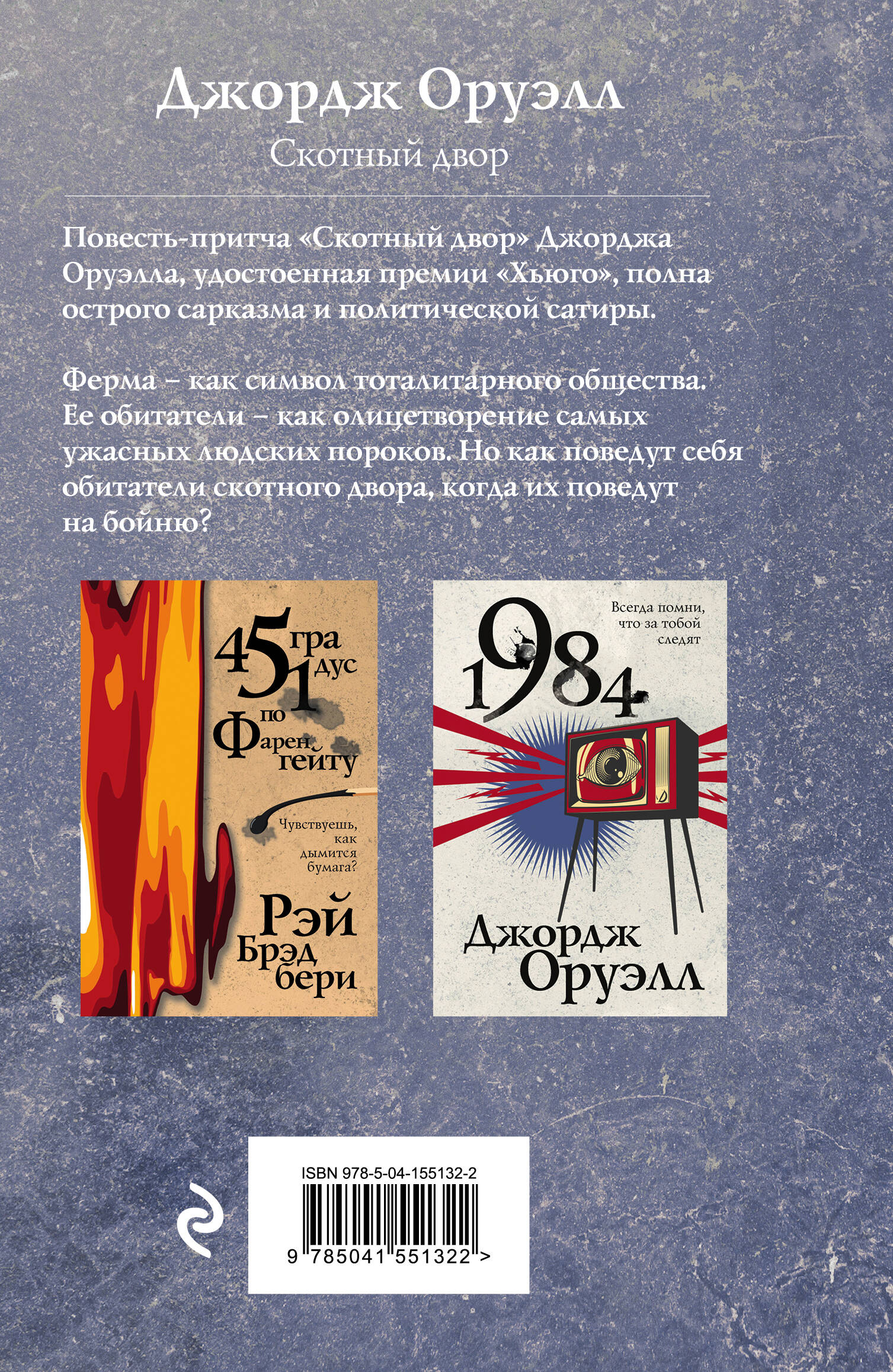 Повесть-притча «Скотный двор» Джорджа Оруэлла, удостоенная премии «Хьюго», полна острого сарказма и политической сатиры. Обитатели фермы олицетворяют самые ужасные людские пороки, а сама ферма становится символом тоталитарного общества. Как будут существовать в таком обществе его обитатели - животные, которых поведут на бойню?| Издательство | ООО "Издательство "Эксмо" |