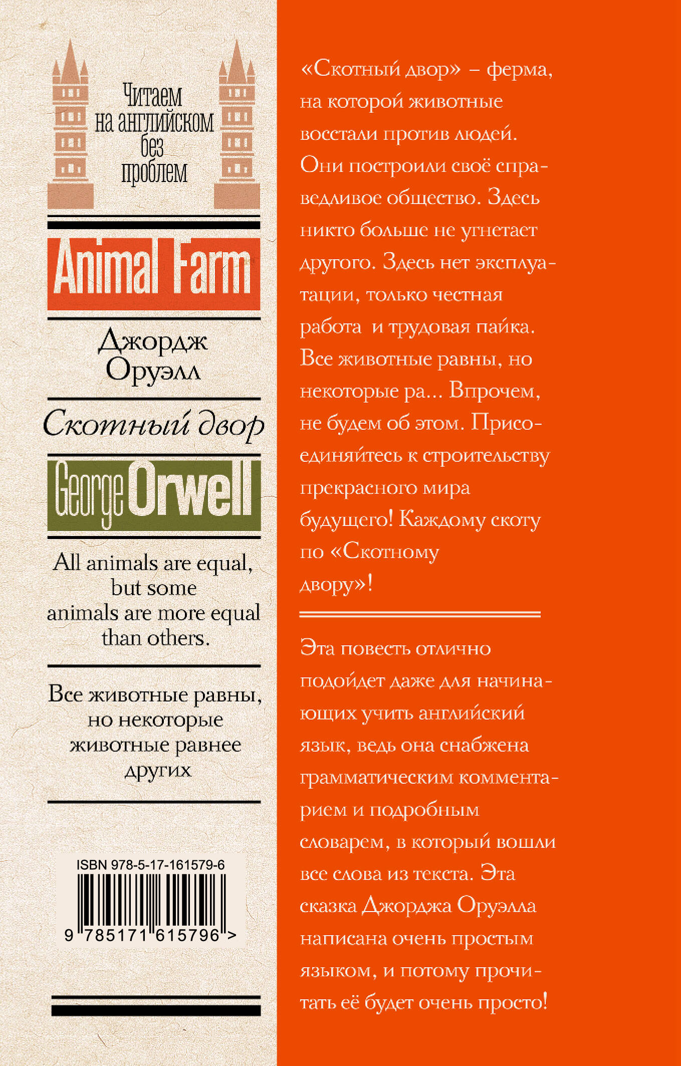 "Скотный двор" - ферма, на которой животные восстали против людей. Они построили своё справедливое общество. Здесь никто больше не угнетает другого. Здесь нет эксплуатации, только честная работа и трудовая пайка. Все животные равны, но некоторые ра… Впрочем, не будем об этом. Присоединяйтесь к строительству прекрасного мира будущего! Каждому скоту по "Скотному двору"! Эта повесть отлично подойдет даже для начинающих учить английский язык, ведь она снабжена грамматическим комментарием и подробным словарем, в который вошли все слова из текста. Адаптация составлена С. А. Матвеевым, опытным автором множества популярных учебников английского. Эта сказка Джорджа Оруэлла написана очень простым языком, и потому прочитать её будет очень просто!| Издательство | Издательство "АСТ" |