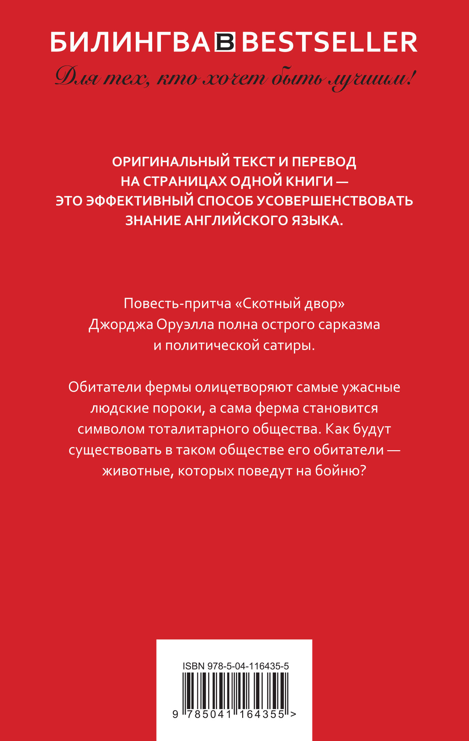 Для тех, кто хочет быть лучшим! Оригинальный текст и перевод на страницах одной книги - это эффективный способ усовершенствовать знание английского языка. Повесть-притча «Скотный двор» Джорджа Оруэлла полна острого сарказма и политической сатиры. Обитатели фермы олицетворяют самые ужасные людские пороки, а сама ферма становится символом тоталитарного общества. Как будут существовать в таком обществе его обитатели - животные, которых поведут на бойню?| Издательство | ООО "Издательство "Эксмо" |