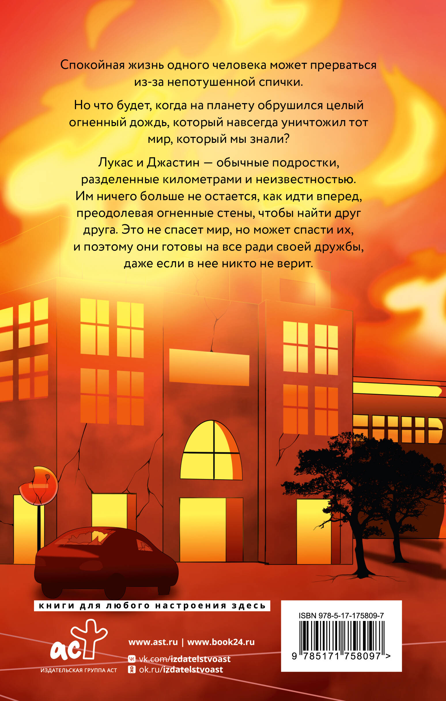 Спокойная жизнь одного человека может прерваться из-за непотушенной спички. Но что будет, когда на планету обрушился целый огненный дождь, который навсегда уничтожил тотмир, который мы знали? Лукас и Джастин - обычные подростки, разделенные километрами и неизвестностью. Им ничего больше не остается, как идти вперед, преодолевая огненные стены, чтобы найти друг друга. Это не спасет мир, но может спасти их, и поэтому они готовы на все ради своей дружбы, даже если в нее никто не верит.| Издательство | Издательство "АСТ" |