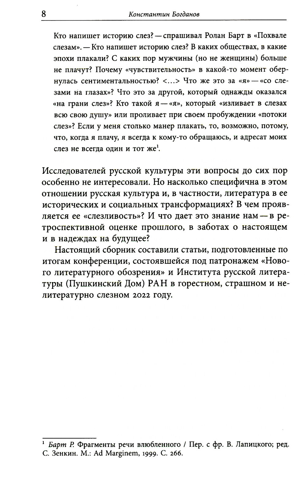 Слезы - универсальная тема для всех мировых культур, однако отношение к ним может быть разным. Проявление эмоций зависит от исторических и социальных обстоятельств, выражается и расценивается во взаимосвязи многих факторов индивидуального и коллективного опыта - традиции, идеологии, границ принуждения и свободы. Авторы сборника «Сквозь слезы» - среди которых Константин Богданов, Илья Виницкий, Светлана Адоньева, Олег Лекманов и другие - пытаются ответить на несколько важных вопросов о русской эмоциональной культуре. Насколько она специфична в своих исторических и социальных трансформациях? В чем проявляется ее «слезливость»? И что дает это знание нам - в ретроспективной оценке прошлого, в заботах о настоящем и надеждах на будущее? Сборник составлен по материалам конференции, состоявшейся в ноябре 2022 года в ИРЛИ (Пушкинский Дом) РАН при поддержке издательства «Новое литературное обозрение».| Издательство | Новое литературное обозрение |