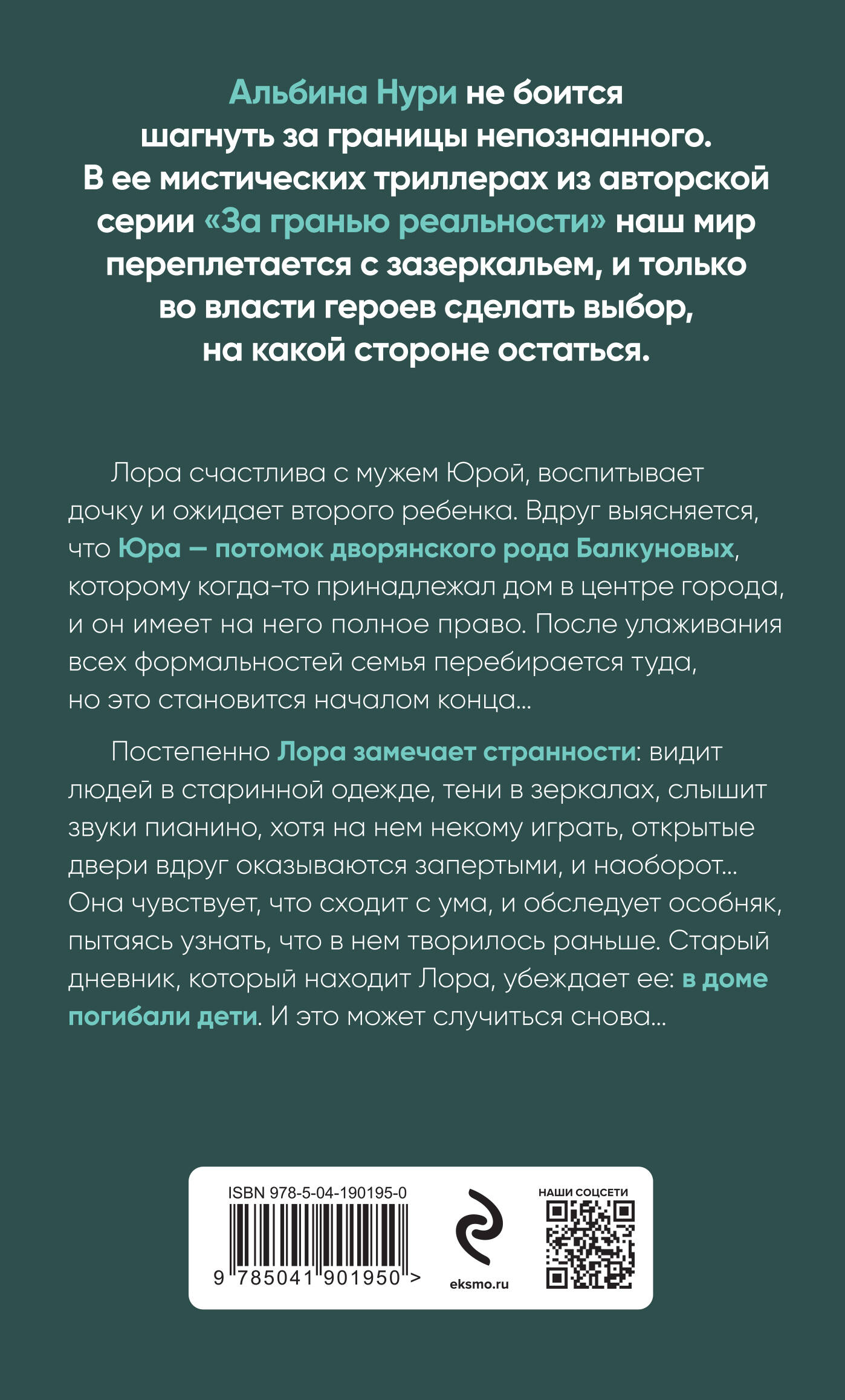 Лора счастлива с мужем Юрой, воспитывает дочку и ожидает второго ребенка. Вдруг выясняется, что Юра - потомок дворянского рода Балкуновых, которому когда-то принадлежал дом в центре города, и он имеет на него полное право. После улаживания всех формальностей семья перебирается туда, но это становится началом конца… Постепенно Лора замечает странности: видит людей в старинной одежде, тени в зеркалах, слышит звуки пианино, хотя на нем некому играть, открытые двери вдруг оказываются запертыми, и наоборот... Она чувствует, что сходит с ума, и обследует особняк, пытаясь узнать, что в нем творилось раньше. Старый дневник, который находит Лора, убеждает ее: в доме погибали дети. И это может случиться снова… Романы Альбины Нури - целый мир, в котором реальность переплетается с мистикой и потусторонним миром, где действуют законы, отличные от законов разума. Герои сталкиваются с необъяснимыми явлениями, идущими вразрез с обыденной картиной мира, и им предстоит через многое пройти, чтобы вернуть свою жизнь в привычное русло. Романы Альбины Нури нравятся как читателям, так и критикам.| Издательство | ООО "Издательство "Эксмо" |