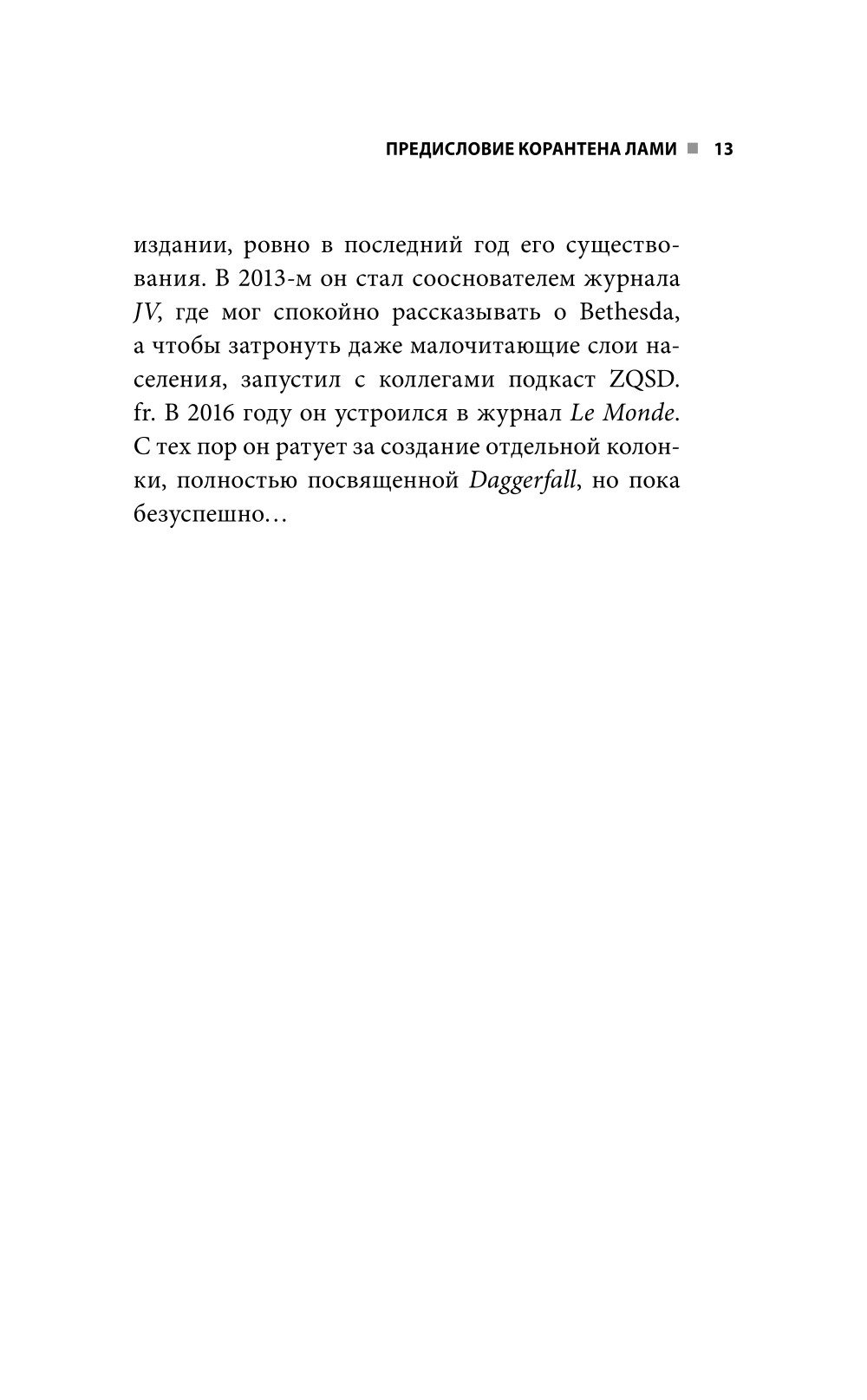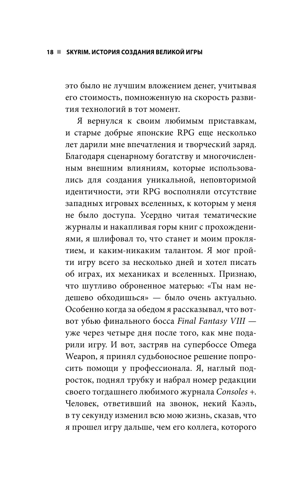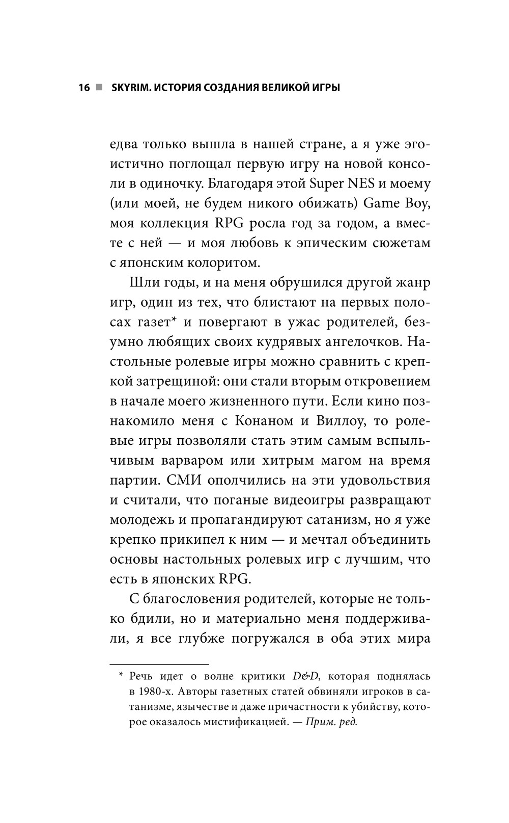 Готов ли ты к битве, Довакин? Skyrim - пятая игра линейки The Elder Scrolls - заслуженно обрела мировую славу. Запустив игру, вы оказываетесь в детально проработанной фэнтезийной вселенной, населенной героями и наемниками разных мастей, монстрами и, конечно же, могущественными драконами. Вашему персонажу, который пока еще не знает о великой судьбе, выпавшей на его долю, предстоит долгий и извилистый путь, в конце которого его ждет встреча с Разрушителем Миров Алдуином. В Skyrim игрок волен свободно исследовать игровой мир и выбирать собственный стиль игры. Атмосфера, музыка, захватывающий геймпллей, в совокупности с другими составляющими, создают незабываемый игровой опыт, пробудивший страсть к жанру RPG у многих геймеров. - Вы узнаете, какие исследования проводили создатели игры, чтобы добиться аутентичности духа игровой вселенной. - Заглянете за кулисы разработки легендарной игры. - Погрузитесь в проработанную до мельчайших деталей историю и лор мира Skyrim. - По-иному взглянете на игровой процесс полюбившейся игры.| Издательство | Эксмо |