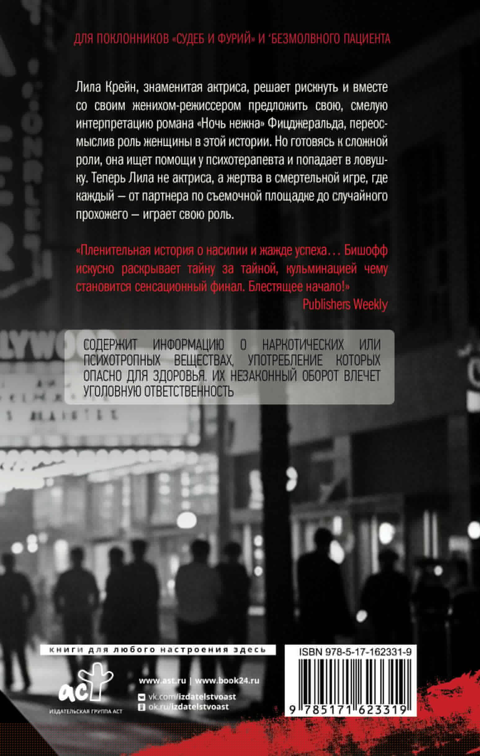 - Яркий дебют драматурга и режиссера, автора постановок на Бродвее. - Выбор редакции Amazon и бестселлер площадки. Роман вышел в 2025 году и в течение всего нескольких месяцев был переведен на 15+ языков. - Смелая интерпретация романа Фрэнсиса Скотта Фицджеральда «Ночь нежна» в жанре психологического триллера. Напряженная история насилия и жажды славы. Какова цена популярности? Как далеко мы готовы ради нее зайти? Эта книга - как шкатулка, где за каждой историей стоит еще одна, а развязка удивит даже искушенных любителей жанра. - Серия «Объявлено убийство».| Издательство | Издательство "АСТ" |