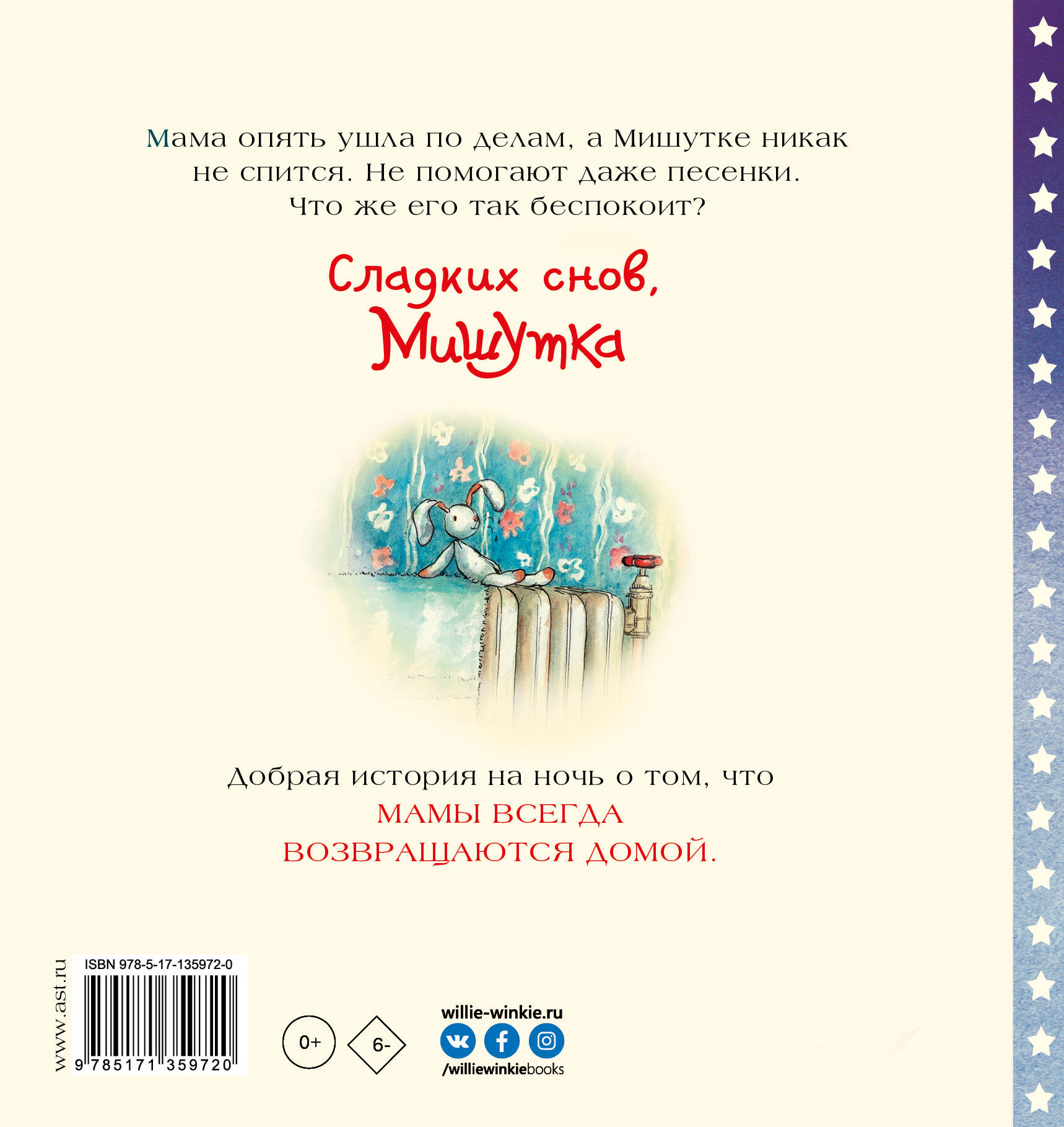 Мишутка почистил зубы, принял ванну и надел свою уютную пижамку. Сегодня мама ушла по делам, поэтому за Мишуткой присматривает мамина подруга, тётя Люси. Она прочитала Мишутке сказку, они спели песенку, но пришло время ложиться спать, а Мишутка всё никак не может заснуть. Что его так беспокоит? "Сладких снов, Мишутка!" - это удивительно тёплая терапевтическая история, которая поможет малышам легко и просто засыпать по вечерам.| Издательство | ИЗДАТЕЛЬСТВО "АСТ" |