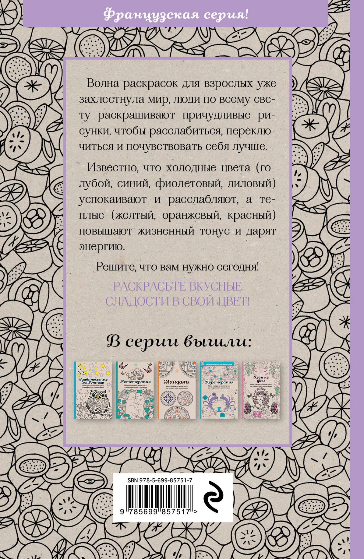 Аннотация: Сладости. Мини-раскраска-антистресс для творчества и вдохновения.