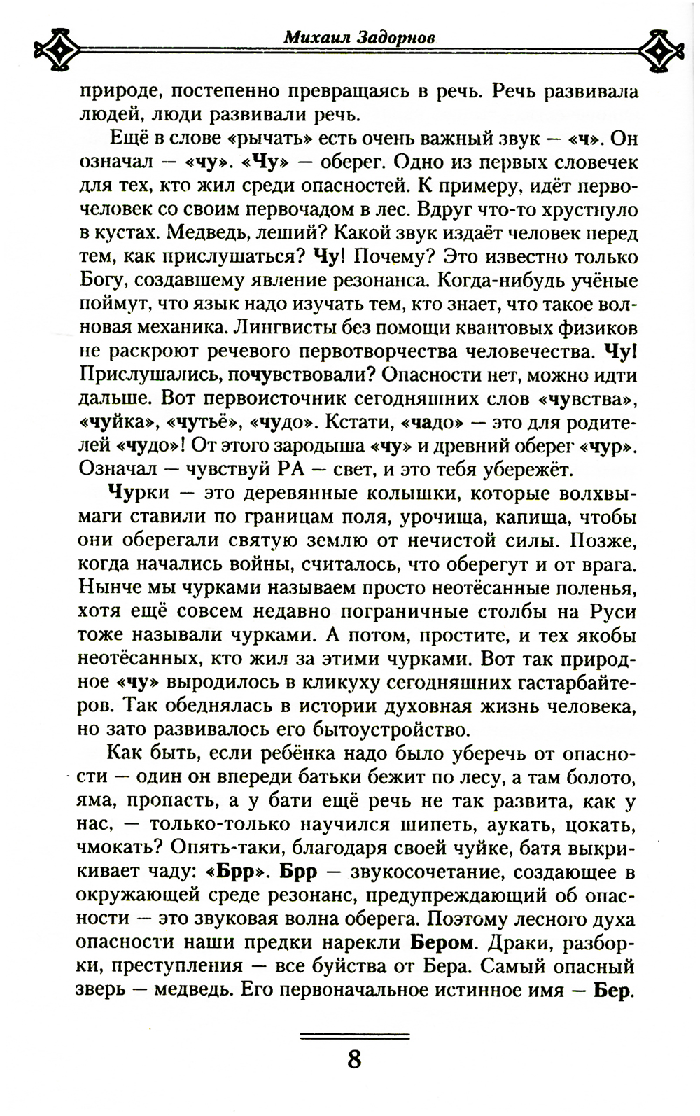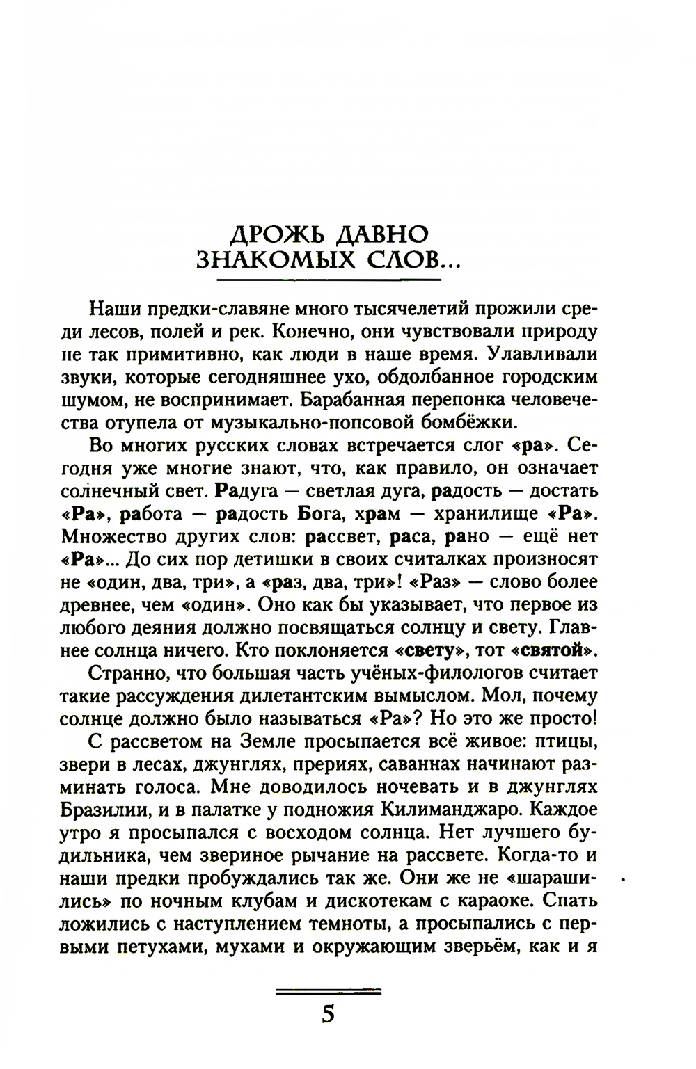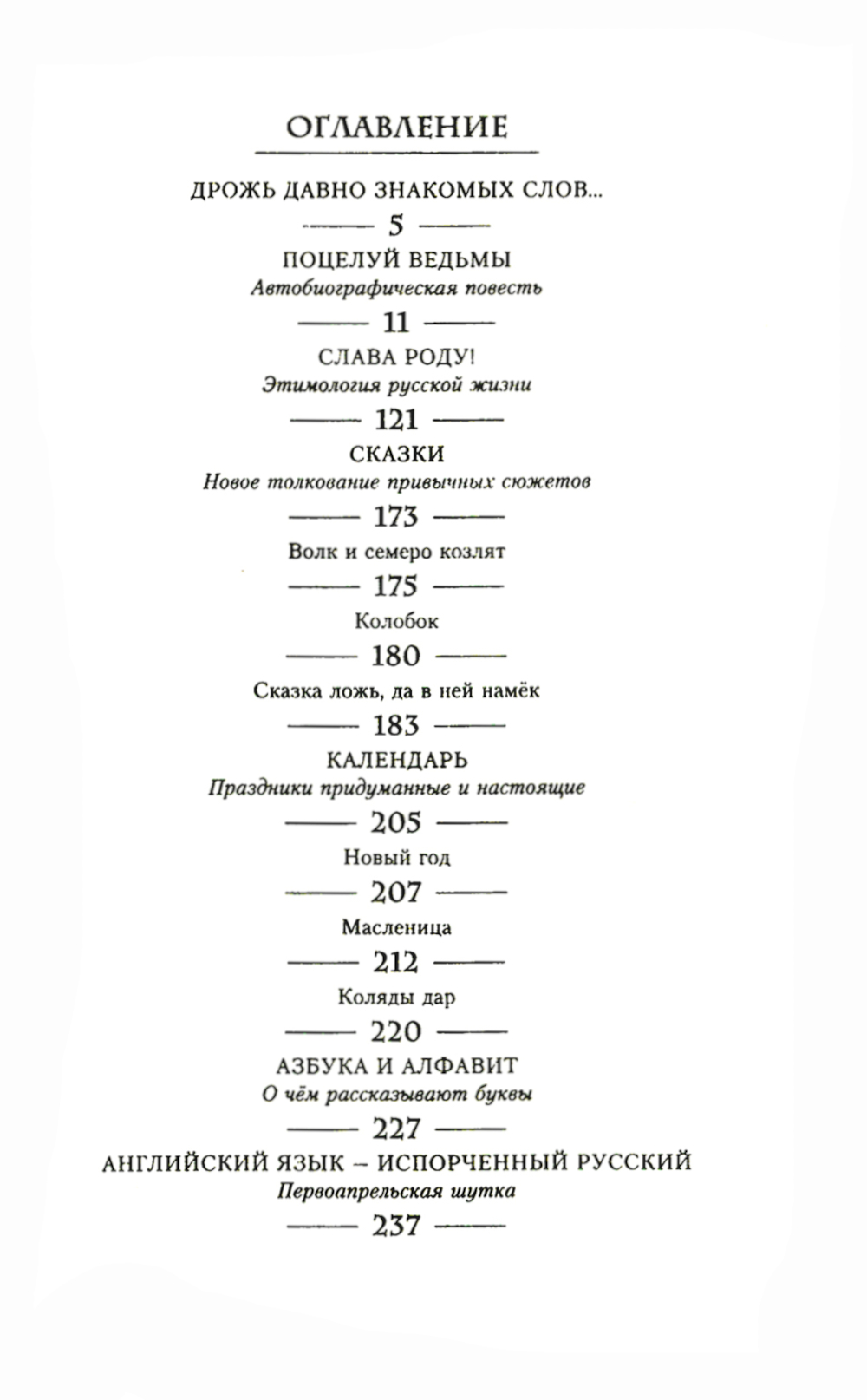 Творчество Михаила Задорнова давно перешагнуло рамки сатиры и юмора. Его интересы разносторонни: нумерология, история, этимология русской жизни и бесконечные расследования по происхождению слов. Как научиться понимать исконный смысл знакомых слов, слышать природную дрожь родного языка? Возможно, кому-то будет достаточно прочитать автобиографическую повесть Михаила Задорнова о том, как он, будучи ещё начинающим журналистом, поехал в Сибирь писать очерк о староверах и встретил в тайге ведьму. С тех пор прошло много времени. Автор путешествовал по миру, вслушивался в речь нашу и других народов. Проводил исследования, сидел в архивах. Призывая славить свой род, Михаил Николаевич рассказывает удивительные вещи о происхождении простых слов: папа, мама, бабушка, тётя - и словзагадок для нынешнего молодого поколения: сноха, деверь, золовка. В этой книге вас ждёт захватывающее толкование сюжетов русских сказок и привычных календарных праздников. Вы услышите, что прошепчут буквы нашего алфавита, и испытаете гордость за родную речь, узнав, что английский язык - испорченный русский.| Издательство | Центрполиграф |