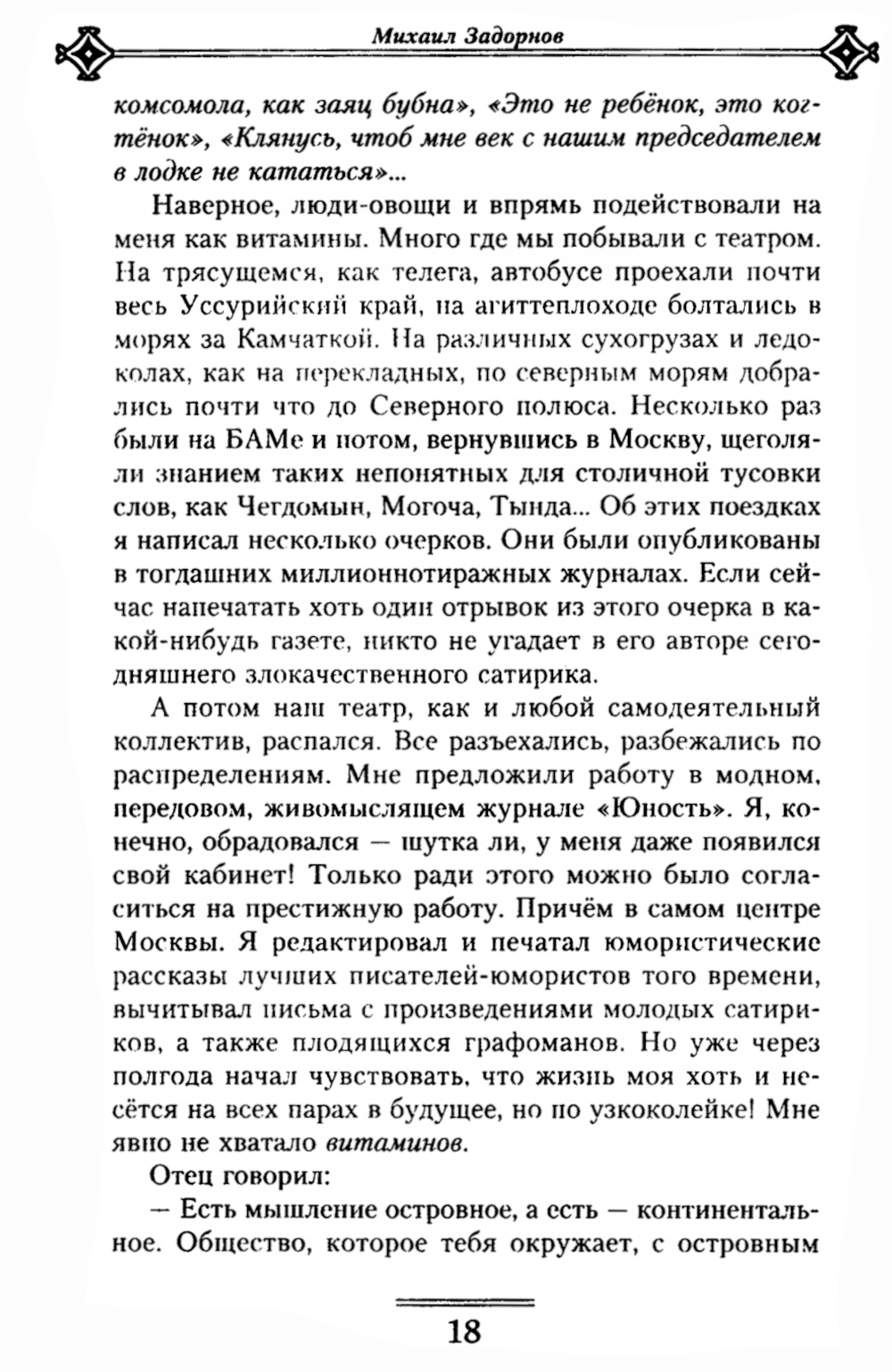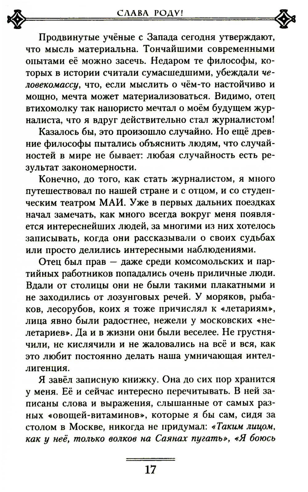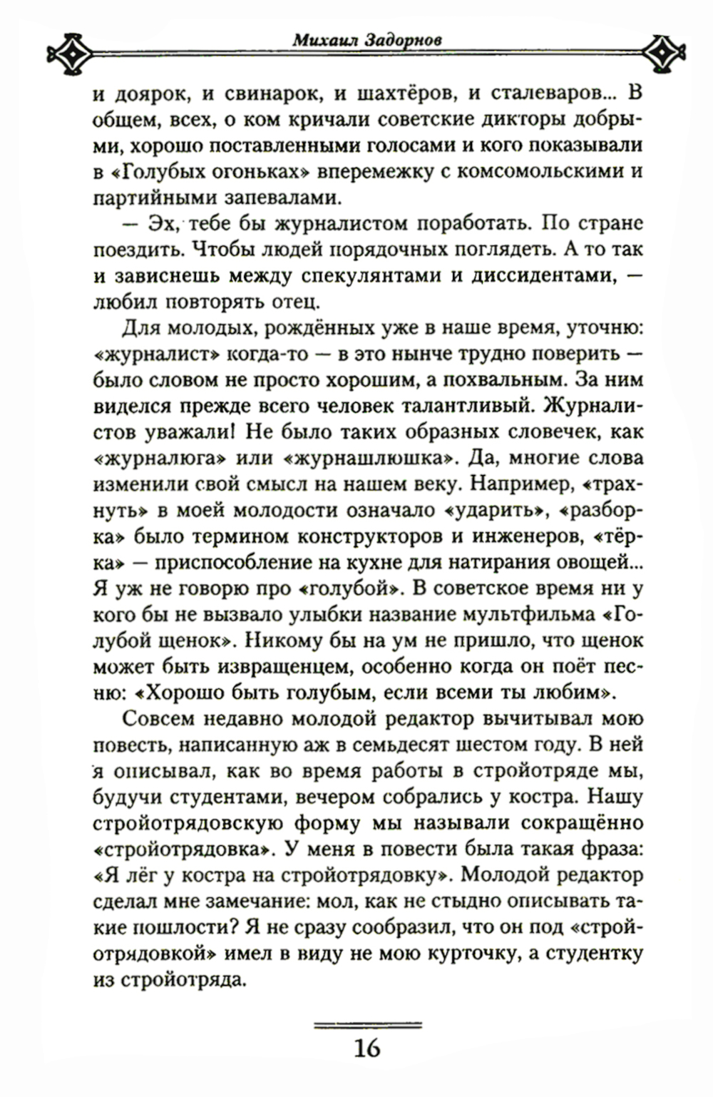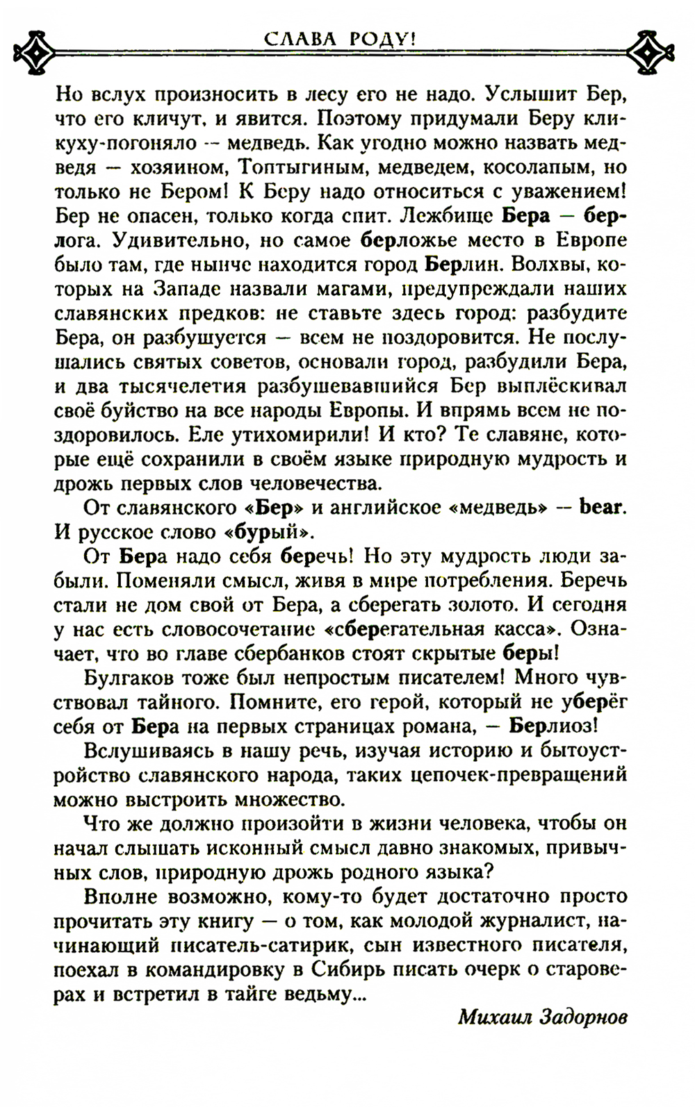 Творчество Михаила Задорнова давно перешагнуло рамки сатиры и юмора. Его интересы разносторонни: нумерология, история, этимология русской жизни и бесконечные расследования по происхождению слов. Как научиться понимать исконный смысл знакомых слов, слышать природную дрожь родного языка? Возможно, кому-то будет достаточно прочитать автобиографическую повесть Михаила Задорнова о том, как он, будучи ещё начинающим журналистом, поехал в Сибирь писать очерк о староверах и встретил в тайге ведьму. С тех пор прошло много времени. Автор путешествовал по миру, вслушивался в речь нашу и других народов. Проводил исследования, сидел в архивах. Призывая славить свой род, Михаил Николаевич рассказывает удивительные вещи о происхождении простых слов: папа, мама, бабушка, тётя - и словзагадок для нынешнего молодого поколения: сноха, деверь, золовка. В этой книге вас ждёт захватывающее толкование сюжетов русских сказок и привычных календарных праздников. Вы услышите, что прошепчут буквы нашего алфавита, и испытаете гордость за родную речь, узнав, что английский язык - испорченный русский.| Издательство | Центрполиграф |