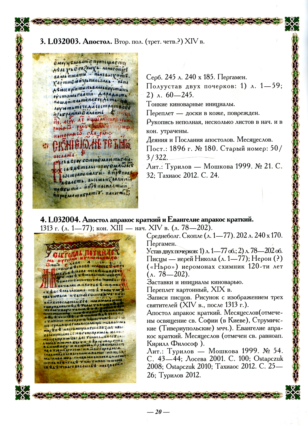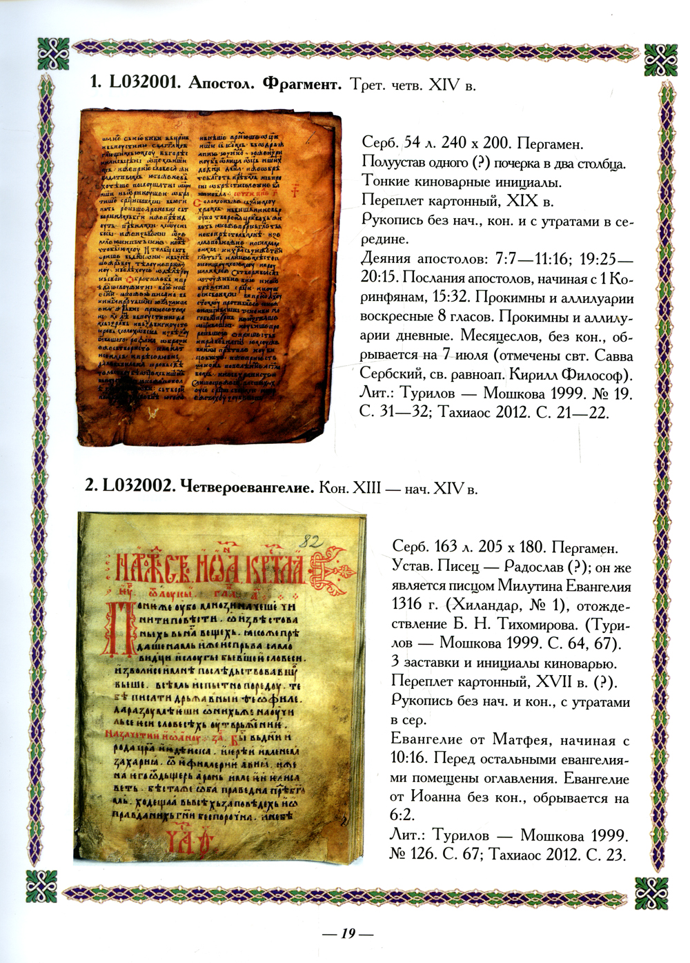 Публикуемый в настоящем томе каталог славяно-русских рукописей Русского Свято-Пантелеимонова монастыря (далее - РПМА) предоставляет наиболее полную на сегодняшний день информацию об этом собрании: в нем даны описания 1435 рукописных единиц. В отношении славянских рукописей РПМА достаточно сказать, что в вышедшем более 30 лет назад (и переизданном в конце прошлого года в переводе на русский) описании славянских манускриптов, составленном проф. А.-Е. Н. Тахиаосом, помещены сведения о 74 рукописях XIII-XIX вв. В неизданных археографических материалах советской научно-исследовательской экспедиции 1983 г. имеются данные о 158 рукописных книгах (включая и отрывки) за тот же хронологический период; 84 из них, датируемые не позднее рубежа XVIII-XIX вв., включены в изданный в 1999 г. сводный каталог славянских рукописей Афона. Публикуемый же каталог содержит описания около 600 книг, тетрадей-брошюр и отрывков на церковнославянском языке5 разных изводов, начиная с XIII в. и вплоть до начала настоящего. Столь значительный прирост числа манускриптов является результатом, с одной стороны, тщательной разборки старого библиотечного фонда, с другой же - выделения материалов недокументального характера из открытого сравнительно недавно и обрабатываемого в последние годы обширного монастырского архива. В итоге рукописное собрание РПМА (и не только славянское) предстает перед потенциальными пользователями - исследователями - в новом свете.| Издательство | Святая Гора Афон |