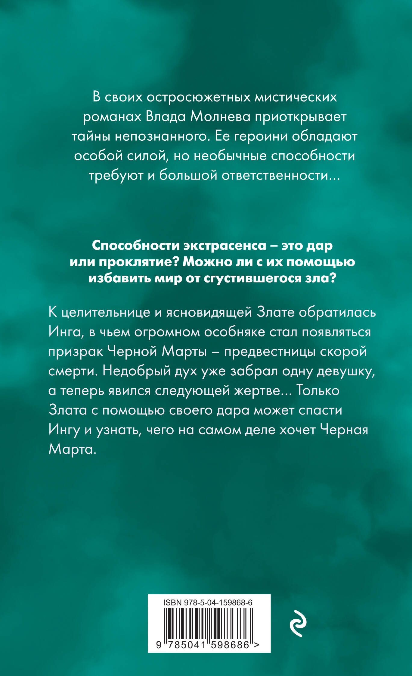 Автор мистических детективов Влада Молниева в серии «За гранью» представляет вторую книгу из цикла о ведьме Злате, которая с помощью своих экстрасенсорных способностей расследует зловещие преступления. Способности экстрасенса - это дар или проклятие? Можно ли с их помощью избавить мир от сгустившегося зла? К целительнице и ясновидящей Злате обратилась девушка Инга, в чьем огромном особняке стал появляться призрак Чёрной Марты - предвестницы скорой смерти. Недобрый дух уже забрал одну девушку, а теперь явился следующей жертве… Только Злата с помощью своего дара может спасти девушку и узнать, чего на самом деле хочет Чёрная Марта.| Издательство | Эксмо |