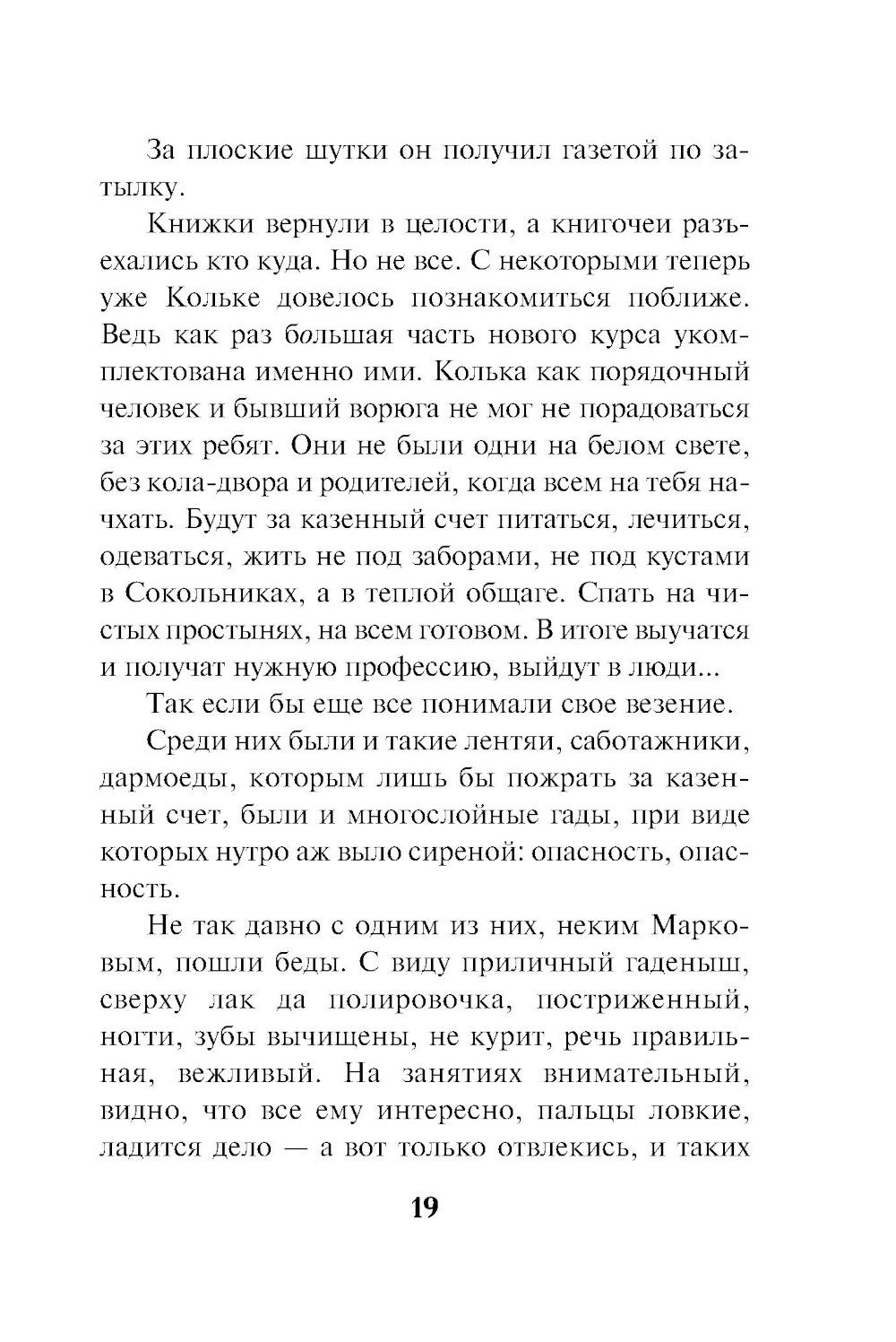Тяжелые послевоенные годы. Чтобы спасти и вывести в люди оставшихся без родителей детей, по всей стране созданы приемники-распределители. В одном из таких заведений помощником мастера работает Колька Пожарский. …В тот злополучный день все ждали зарплату. Но кассирша вовремя не появилась. Колька нашел ее смертельно раненной на пороге главного корпуса. Вдалеке быстро удалялся мужской силуэт. Пожарский, не раздумывая, кинулся за преступником. Но во время погони грабитель неожиданно бросился под поезд. Сумка с деньгами бесследно исчезла… Отвечать бы Кольке по всей строгости закона за грабеж и убийство кассирши, если бы оперативникам внезапно не открылась истинная, куда более страшная картина преступления…| Издательство | Эксмо |