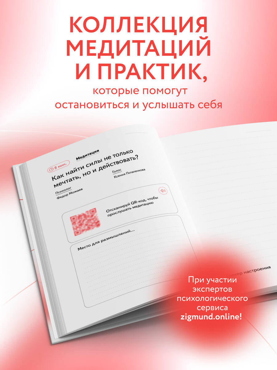 Этот блокнот - твой личный спутник, созданный командой «Этажей» с заботой и вниманием, чтобы поддержать тебя на пути к мечтам и внутренней гармонии. Вместе с экспертами сервиса для заботы о ментальном здоровье zigmund.online мы создали для тебя коллекцию медитаций и практик, что помогают остановиться и услышать себя. Мы, команда «Этажей», вложили в этот блокнот частичку себя: придумали концепцию, озвучили медитации и написали слова, которые согревают нас самих в непростые моменты. Пусть они станут поддержкой и для тебя. Порой достаточно просто начать писать, чтобы услышать внутренний голос. Через письмо мы освобождаем мысли, снимаем внутренние зажимы и открываемся новым мечтаниям. Мы рядом, чтобы помочь тебе настроиться на себя и позволить себе быть настоящим. Этот блокнот не похож на привычные. Здесь все иначе: не ты ведешь его - он ведет тебя.| Издательство | ООО "Издательство "Эксмо" |