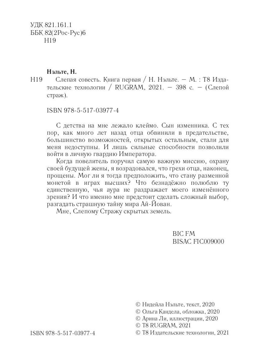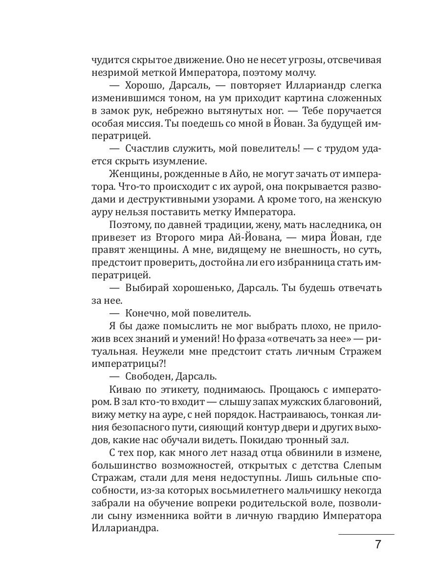 С детства на мне лежало клеймо. Сын изменника. С тех пор, как много лет назад отца обвинили в предательстве, большинство возможностей, открытых остальным, стали для меня недоступны. И лишь сильные способности позволили войти в личную гвардию Императора. Когда повелитель поручил самую важную миссию, охрану своей будущей жены, я возрадовался, что грехи отца, наконец, прощены. Мог ли я тогда предположить, что стану разменной монетой в играх высших? Что безнадёжно полюблю ту единственную, чья аура не раздражает моего изменённого зрения? И что именно мне предстоит сделать сложный выбор, разгадать страшную тайну мира Ай-Йован. Мне, Слепому Стражу скрытых земель.| Издательство | Т8 RUGRAM |