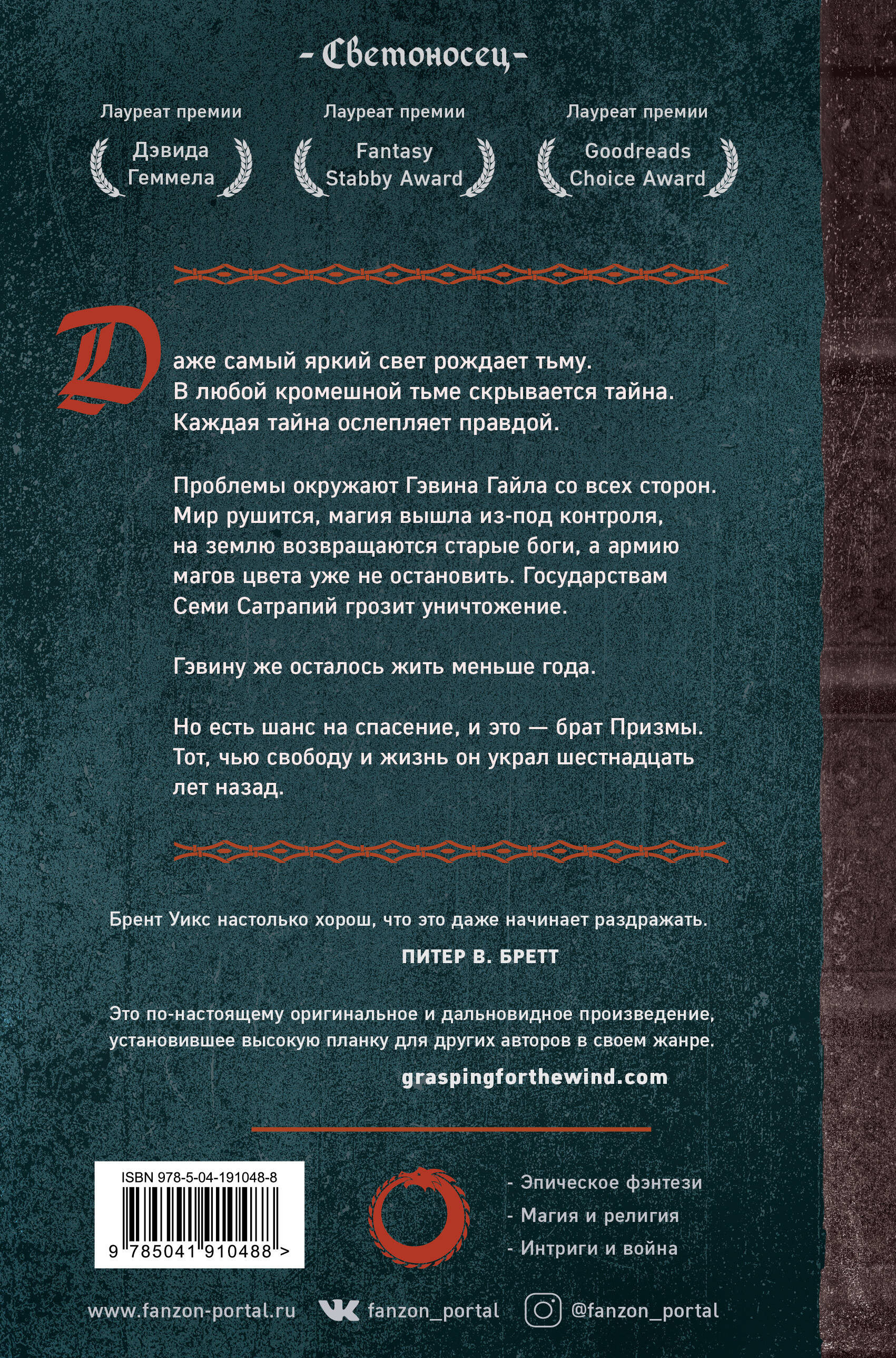 Лауреат премии Дэвида Геммела. Лауреат премии r/Fantasy Stabby Award. Номинант на премию «Индевор». Номинант на премию Goodreads Choice Award. Даже самый яркий свет рождает тьму. В любой кромешной тьме скрывается тайна. Каждая тайна ослепляет правдой. Гэвин Гайл умирает. Он рассчитывал на пять лет, но теперь у него осталось меньше года. Пятьдесят тысяч беженцев, внебрачный сын и бывшая невеста, которая, кажется, узнала самый страшный секрет Призмы - проблемы окружают Гэвина со всех сторон. Вся магия мира вышла из-под контроля и грозит уничтожить Семь Сатрапий. Хуже всего, что в мир возвращаются старые боги, и поклоняющуюся им армию магов цвета уже не остановить. Единственный шанс на спасение Гайла - брат, чью свободу и жизнь Гэвин украл шестнадцать лет назад. «Брент Уикс настолько хорош, что это даже начинает раздражать». - Питер В. Бретт, автор романа «Копье пустыни» «Второй роман цикла оказался даже лучше первого (а это уже о чем-то говорит!)». ― B&N.com «Одно из лучших прочитанных когда-либо эпических фэнтези». ― Staffer's Book Review «Это прекрасное произведение в жанре фэнтези с интересными персонажами, сталкивающимися с безупречным антагонистом, в изобретательно выстроенном и все более хаотичном мире с богатой фантазией и интересной политикой. Уикс не отступает от классических традиций жанра, но при этом привносит в него новый интересный колорит». ― The Ranting Dragon «Автор написал эпическое фэнтези, не похожее ни на одно из созданных его современниками. Это по-настоящему оригинальное и дальновидное произведение, установившее высокую планку для других авторов в своем жанре». ― graspingforthewind.com| Издательство | ООО "Издательство "Эксмо" |