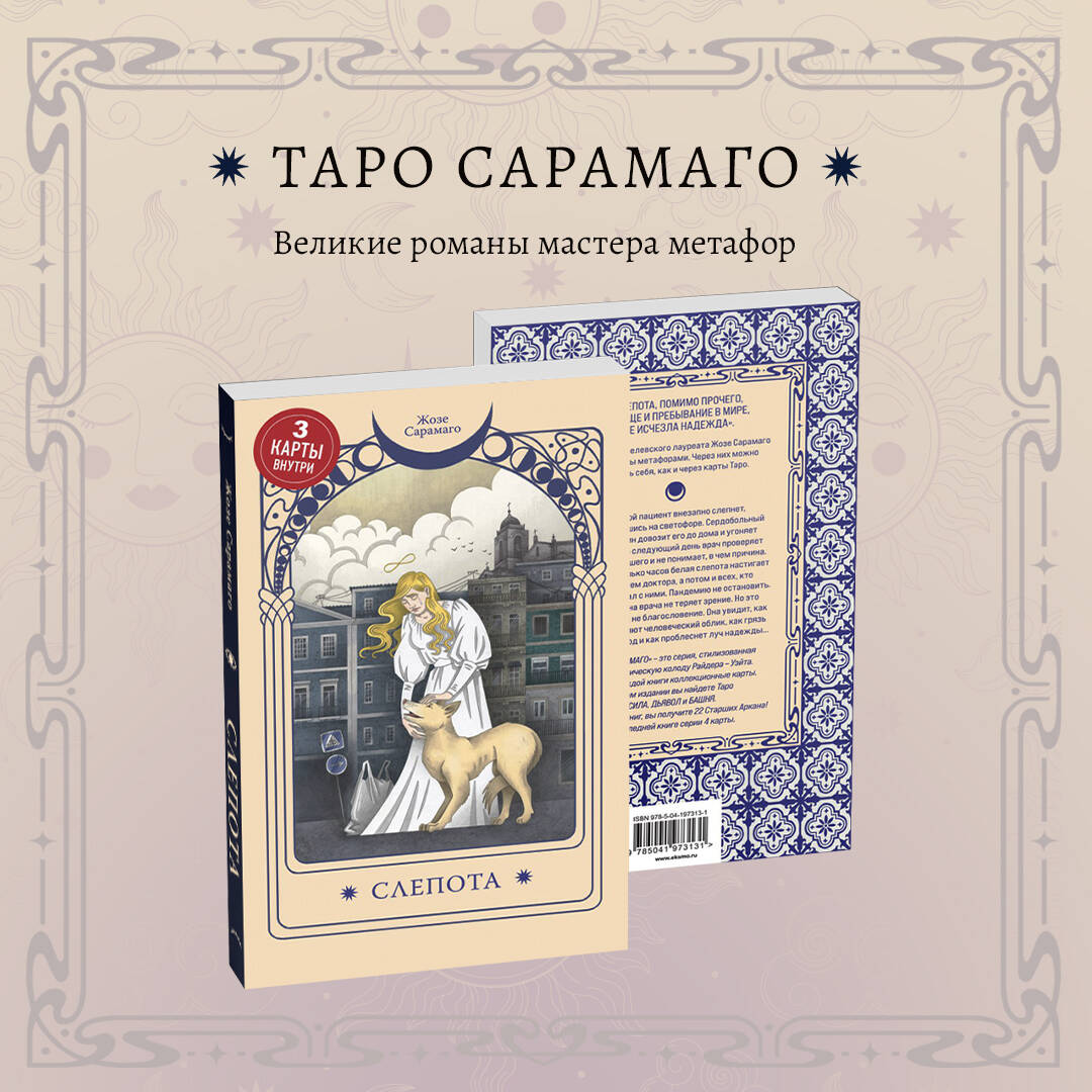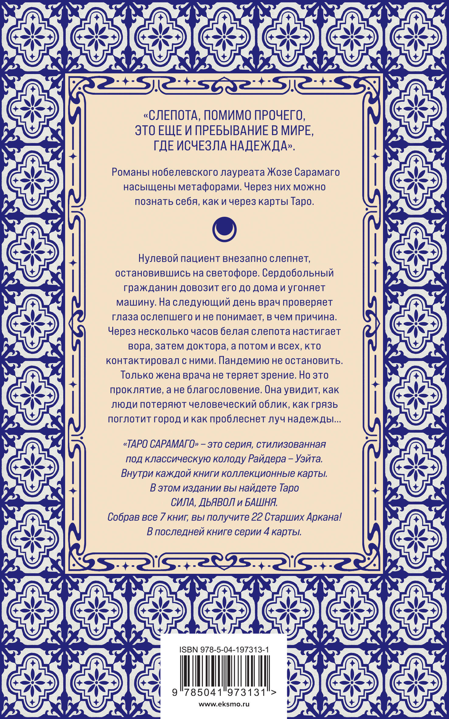 «Таро Сарамаго» - это серия, стилизованная под классическую колоду Райдера-Уэйта. Внутри каждой книги коллекционные карты. В этом издании вы найдете Таро Сила, Дьявол и Башня. Собрав все 7 книг, вы получите 22 Старших Аркана! В последней книге серии 4 карты. «Слепота, помимо прочего, это ещё и пребывание в мире, где исчезла надежда». Нулевой пациент внезапно слепнет, остановившись на светофоре. Сердобольный гражданин довозит его до дома и угоняет машину. На следующий день врач проверяет глаза ослепшего и не понимает, в чем причина. Через несколько часов белая слепота настигает вора, затем доктора, а потом и всех, кто контактировал с ними. Пандемию не остановить. Только жена врача не теряет зрение. Но это проклятие, а не благословение. Она увидит, как люди потеряют человеческий облик, как грязь поглотит город и как проблеснет луч надежды… Это роман-катастрофа. Роман-метафора. Слепота моральная становится слепотой физической. Авторский стиль писателя - отсутствие выделения прямой речи, восклицательных и вопросительных знаков - заставляет читателя потерять привычные ориентиры и в аллегорическом смысле погрузиться в слепоту. Романы нобелевского лауреата Жозе Сарамаго насыщены метафорами. Через них можно познать себя, как и через карты Таро. По мотивам книги «Слепота» был снят одноименный фильм, главные роли в котором исполнили Джулианна Мур и Марк Руффало. В серию входят: «Слепота» «Евангелие от Иисуса» «Воспоминания о монастыре» «Перебои в смерти» «Каменный плот» «Странствие слона» «Год смерти Рикардо Рейса»| Издательство | ООО "Издательство "Эксмо" |