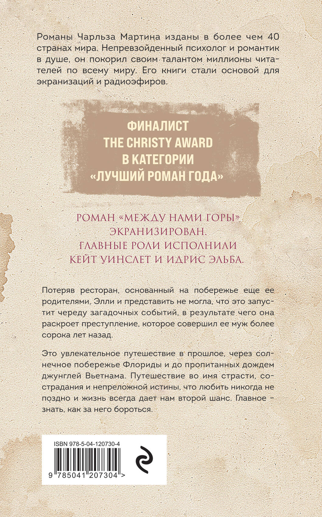 «Трогательная история о любви, потере и истинном значении дружбы». - RT Book Reviews «Любовь устремляется туда, куда другие не пойдут. Туда, где летают пули. Она встает между ними. Жертвует собой». Каково осознавать, что твоя жизнь пошла прахом из-за обмана близкого человека? Понимать, что твое доверие и любовь обманули? И разве можно исправить то, что уходит корнями в прошлое на десятки лет? Потеряв ресторан, основанный на побережье еще ее родителями, Элли и представить не могла, что это запустит череду загадочных событий, в результате которых она раскроет преступление, которое совершил ее муж более сорока лет назад. Это увлекательное путешествие в прошлое, через солнечное побережье Флориды и до пропитанных дождем джунглей Вьетнама. Путешествие во имя страсти, сострадания и непреложной истины, что любить никогда не поздно и жизнь всегда дает нам второй шанс. Главное - знать, как за него бороться. От автора бестселлеров «Между нами горы» и «Когда поют сверчки».| Издательство | ООО "Издательство "Эксмо" |