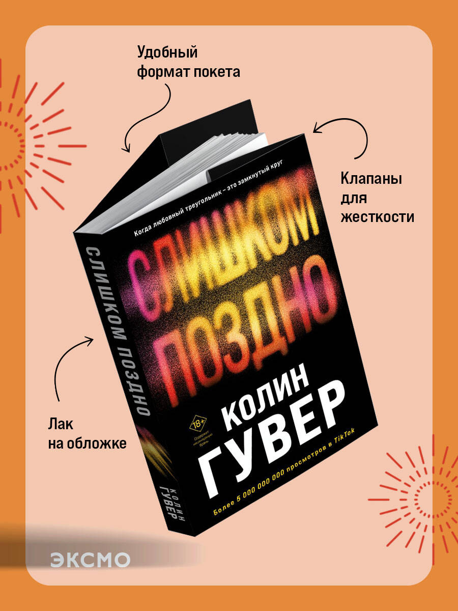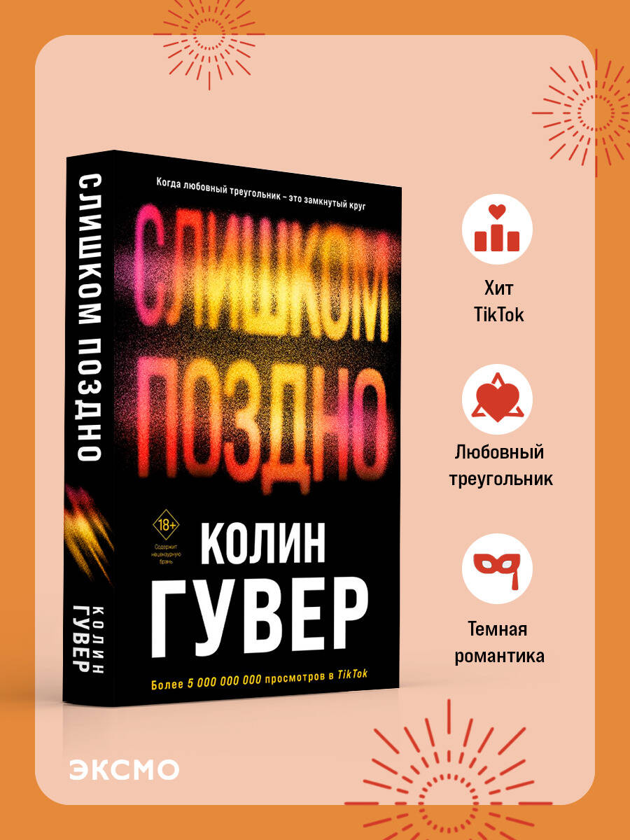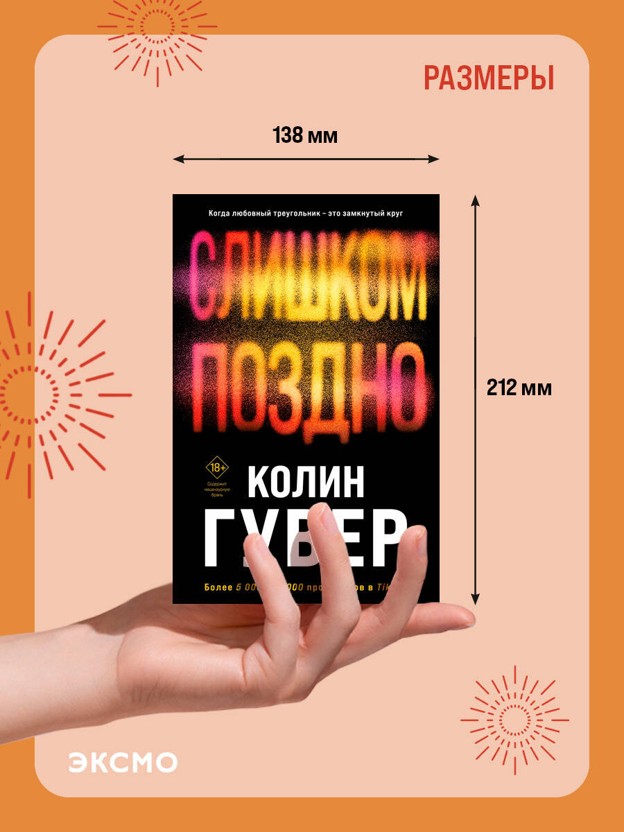 Колин Гувер - автор, которому читатели доверяют свое сердце. Новый роман «Слишком поздно» разобьет его вдребезги. Более 5 000 000 000 просмотров в TikTok. Новый голос любимого автора. Эксклюзивный подарок только в первом тираже. Колин Гувер - литературный феномен нашего времени, троекратная обладательница премии Goodreads Choice Award в номинации «Любовный роман». Ее произведения переведены на десятки языков. Она - мировой тренд. Продажи книг Колин Гувер превысили продажи Стивена Кинга и Джорджа Мартина. Свет - главный символ этой книги. Когда кажется, что все вокруг погрузилось во мрак, помни про внутренний свет, чтобы увидеть свою дорогу. Слоун смогла найти у себя внутри лучик надежды и победила тьму. Свети и не смотри назад. «Я не заслуживаю того, как он со мной поступил. Никто такого не заслуживает. Надо убираться отсюда, и поскорее, пока не стало слишком поздно». Ад - не что иное, как отношения студентки Слоун с наркоторговцем Эйсой. Она бы давно ушла от него, но он содержит ее больного брата. Эйса знает о каждом ее шаге, и ей не выбраться из этой ловушки. Все меняется, когда в жизни Слоун появляется Картер, полицейский под прикрытием, который должен раскрыть Эйсу. Девушка чувствует, что ее влечет к Картеру и эти чувства взаимны. Эйса не остановится ни перед чем, чтобы уничтожить любого, кто встанет на его пути. Его одержимость растет с каждым днем, и теперь Слоун и Картер должны найти выход, пока не стало слишком поздно… «Только мы решаем, победит ли внутри нас тьма. Слоун, хрупкая девушка, скованная обстоятельствами и стокгольмским синдромом, получит шанс на спасение. Эйса, поломанный и обреченный, сделает все, чтобы ее удержать». - Джулия Вольмут, писательница| Издательство | ООО "Издательство "Эксмо" |