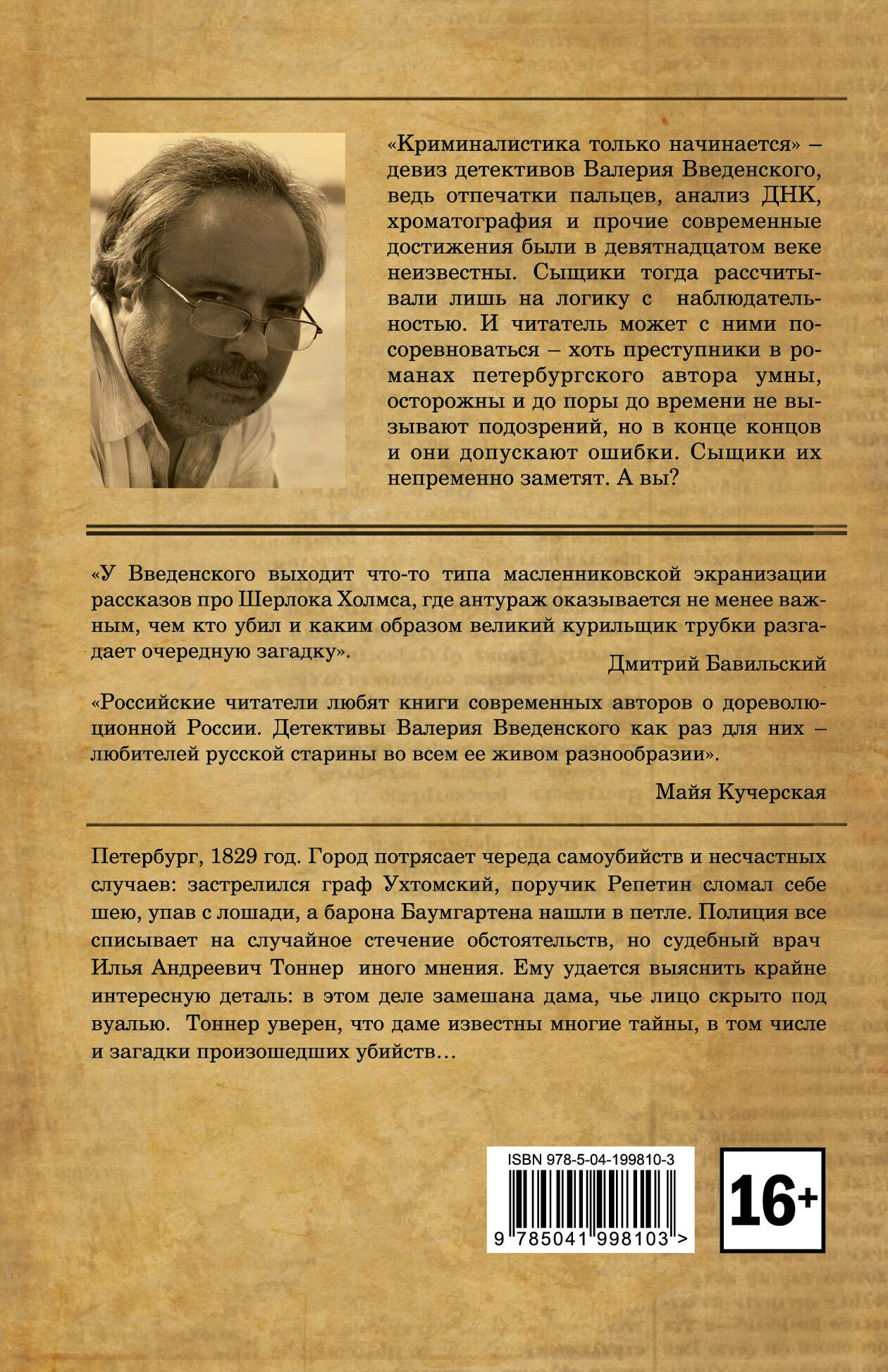 «Криминалистика только начинается» - девиз детективов Валерия Введенского, ведь отпечатки пальцев, анализ ДНК, хроматография и прочие современные достижения были в девятнадцатом веке неизвестны. Сыщики тогда рассчитывали лишь на логику с наблюдательностью. И читатель может с ними посоревноваться - хоть преступники в романах петербургского автора умны, осторожны и до поры до времени не вызывают подозрений, но в конце концов и они допускают ошибки. Сыщики их непременно заметят. А вы? «У Введенского выходит что-то типа маслениковской экранизации рассказов про Шерлока Холмса, где антураж оказывается не менее важным, чем кто убил и каким образом великий курильщик трубки разгадает очередную загадку». - Дмитрий Бавильский «Российские читатели любят книги современных авторов о дореволюционной России. Детективы Валерия Введенского как раз для них - любителей русской старины во всем ее живом разнообразии». - Майя Кучерская Петербург, 1829 год. Город потрясает череда самоубийств и несчастных случаев: застрелился граф Ухтомский, поручик Репетин сломал себе шею, упав с лошади, а барона Баумгартена нашли в петле. Полиция все списывает на случайное стечение обстоятельств, но судебный врач, Илья Андреевич Тоннер, иного мнения. Ему удается выяснить крайне интересную деталь: в этом деле замешана дама, чье лицо скрыто под вуалью. Тоннер уверен, что даме известны многие тайны, в том числе и загадки произошедших убийств…| Издательство | ООО "Издательство "Эксмо" |