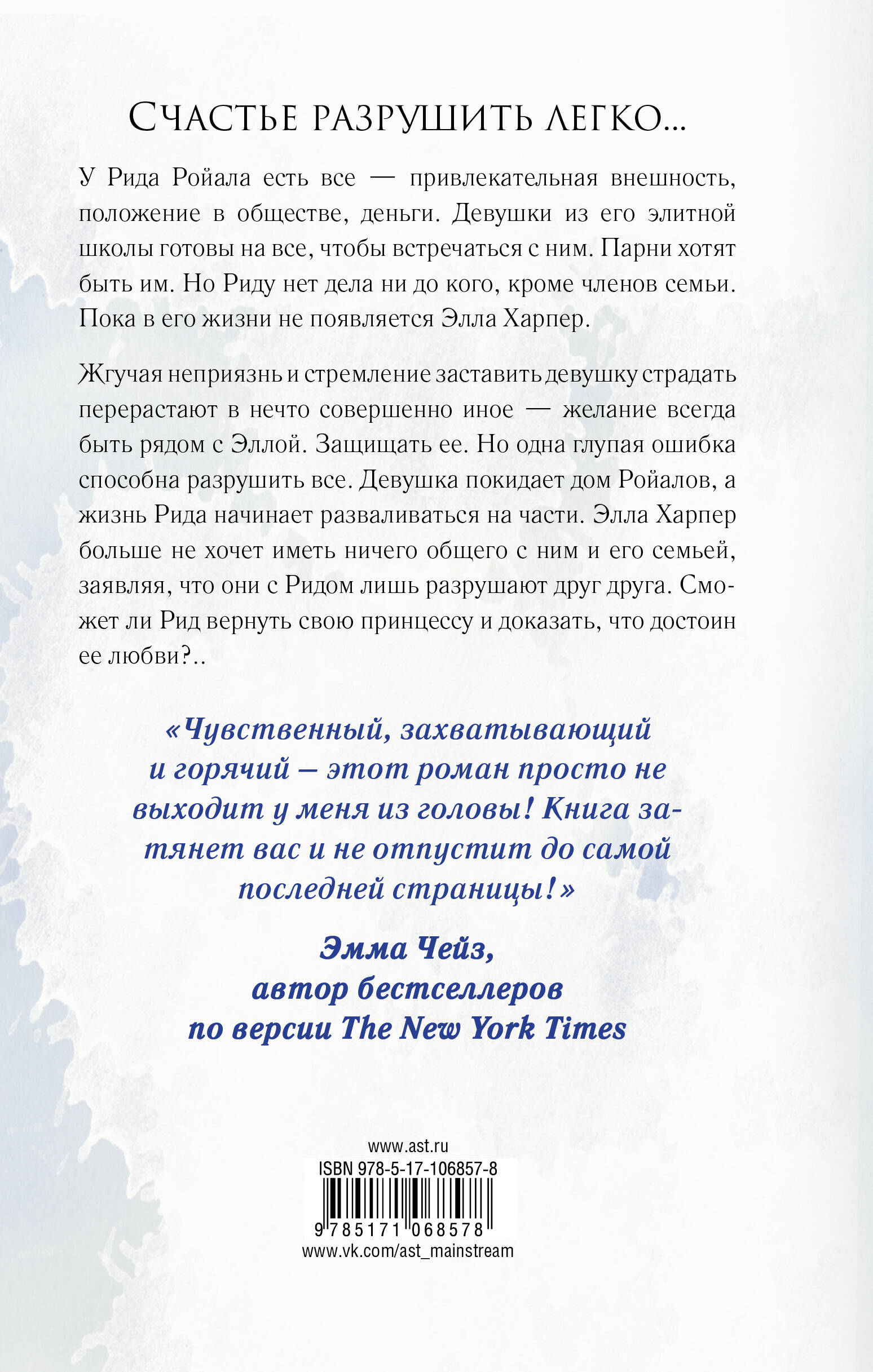 История новой золушки полная интриг, "Жестоких игр" и "Опасных связей". Продолжение бестселлера "Бумажная принцесса". У Рида Ройала есть все - привлекательная внешность, положение в обществе, деньги. Девушки из его элитной школы готовы на все, чтобы встречаться с ним. Парни хотят быть им. Но Риду нет дела ни до кого, кроме членов семьи. Пока в его жизни не появляется Элла Харпер. Жгучая неприязнь и стремление заставить девушку страдать перерастают в нечто совершенно иное - желание всегда быть рядом с Эллой. Защищать ее. Но одна глупая ошибка способна разрушить все. Девушка покидает дом Роялов, а жизнь Рида начинает разваливаться на части. Элла Харпер больше не хочет иметь ничего общего с ним и его семьей, заявляя, что они с Ридом лишь разрушают друг друга. Возможно, девушка права… Сможет ли Рид вернуть свою принцессу и доказать, что достоин ее любви?.."| Издательство | ИЗДАТЕЛЬСТВО "АСТ" |