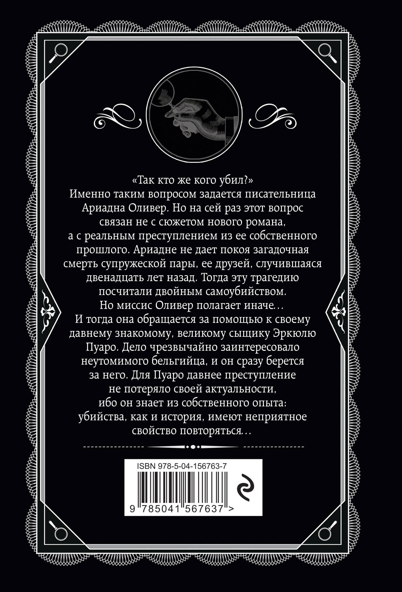 «Так кто же кого убил?» Именно таким вопросом задается писательница Ариадна Оливер. Но на сей раз этот вопрос связан не с сюжетом нового романа, а с реальным преступлением из ее собственного прошлого. Ариадне не дает покоя загадочная смерть супружеской пары, ее друзей, случившаяся двенадцать лет назад. Тогда эту трагедию посчитали двойным самоубийством. Но миссис Оливер полагает иначе… И тогда она обращается за помощью к своему давнему знакомому, великому сыщику Эркюлю Пуаро. Дело чрезвычайно заинтересовало неутомимого бельгийца, и он сразу берется него. Для Пуаро давнее преступление не потеряло своей актуальности, ибо он знает из собственного опыта: убийства, как и история, имеют неприятное свойство повторяться…| Издательство | ООО "Издательство "Эксмо" |