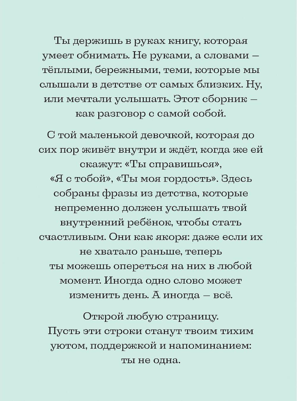 Иногда нам всем нужно одно простое чудо - услышать, что с нами всё будет хорошо. Что мы справимся. Что мы важны, любимы. Что мы нужны - такими, какие есть. ЭТА КНИГА СОЗДАНА, ЧТОБЫ СКАЗАТЬ ТЕБЕ ЭТО. Словами, будто пришедшими из детства, из любящего сердца. Она собрана из сотен тёплых фраз, которые мы слышали в детстве от самых близких. Или мечтали услышать. Но теперь ты можешь сказать их себе. Или - своему внутреннему ребёнку. ЭТО НЕ ПРОСТО СБОРНИК СЛОВ. Это - мягкое одеяло из фраз, под которыми можно укрыться в трудный день. Это разговор с той самой маленькой девочкой внутри, которая до сих пор ждёт одобрения, поддержки, любви.