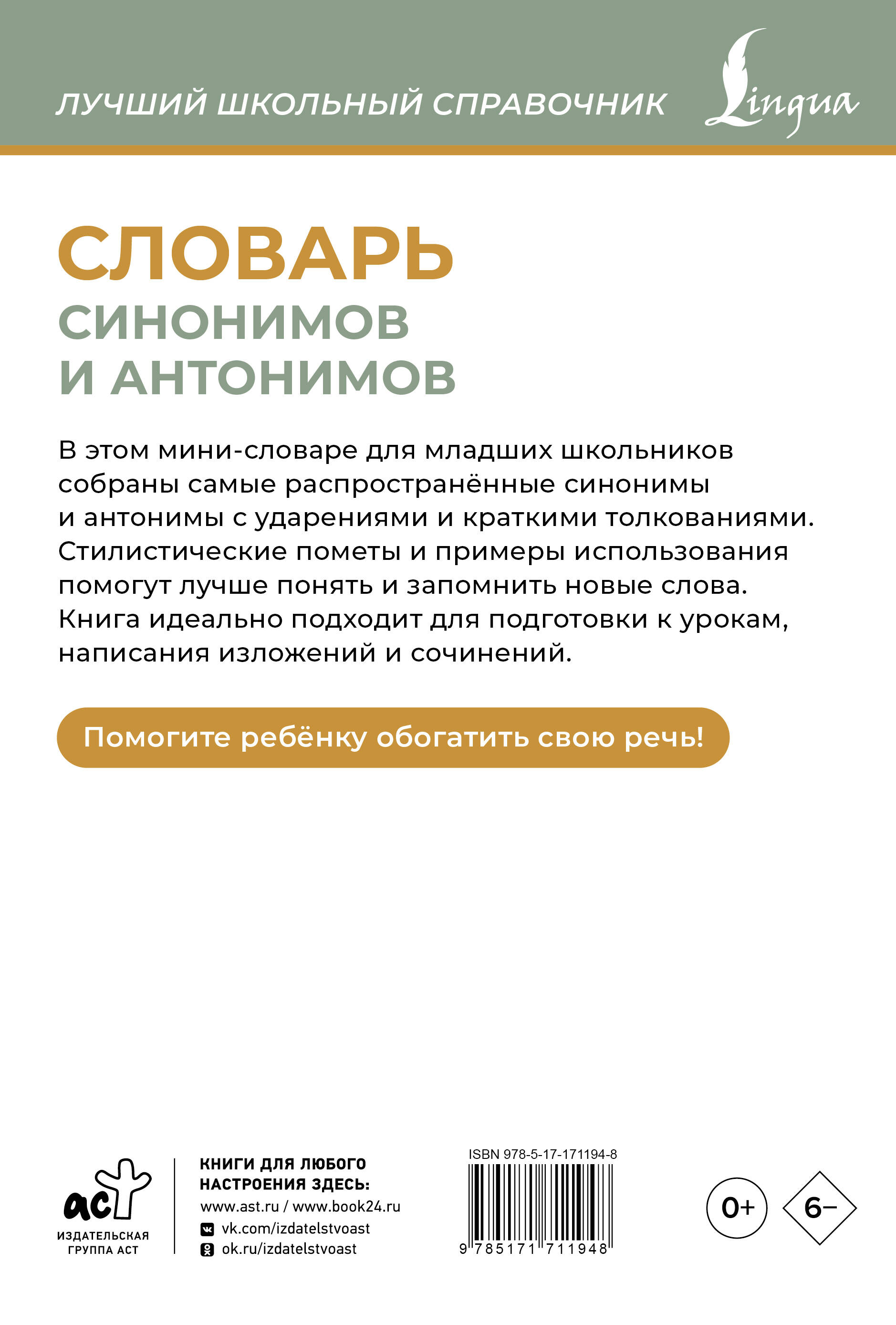 Этот мини-словарь содержит самые востребованные синонимы и антонимы современного русского языка, которые должны быть известны младшим школьникам. В издании каждое заголовочное слово снабжено ударением; даётся краткое толкование, синонимы сопровождаются стилистическими пометами. Все слова проиллюстрированы примерами. Издание предназначено для учащихся в начальной школе. Книга поможет при подготовке к урокам, тренировке написания изложений и сочинений, а также обогатит культуру речи в целом.| Издательство | Издательство "АСТ" |