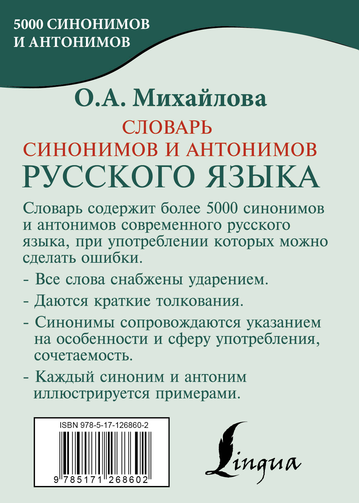 "Словарь синонимов и антонимов русского языка" содержит более 5000 слов. Все слова, кроме односложных, снабжены ударением. К каждому слову даётся краткое толкование, синонимы сопровождаются стилистическими пометами. Словарные статьи проиллюстрированы примерами. Издание предназначено для учащихся школ, студентов и преподавателей. Станет хорошим помощником при подготовке к урокам и экзаменам. Книга поможет также тем, кто стремится лучше овладеть родным языком, повысить культуру речи, обогатить свой словарный запас.| Издательство | Издательство "АСТ" |
